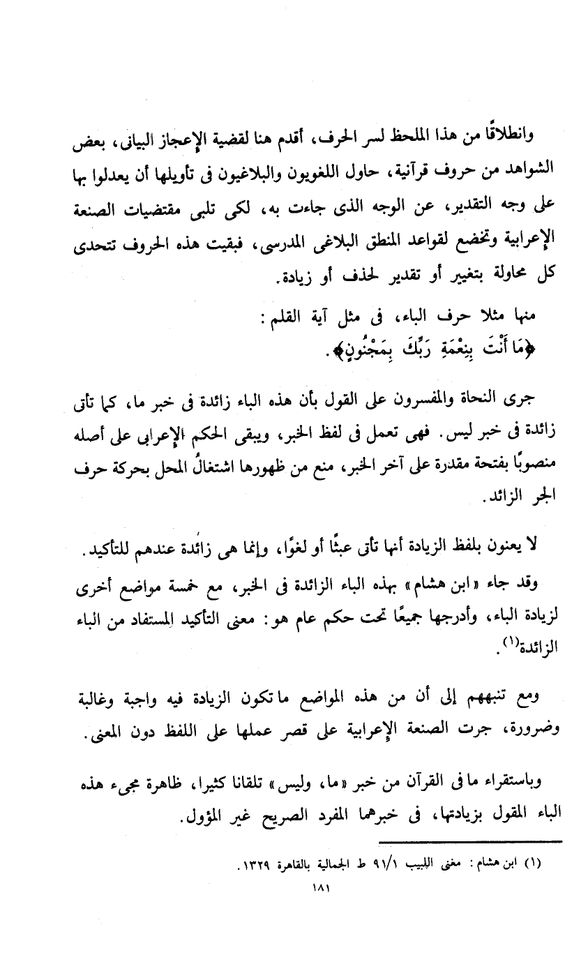 لا يعنون بلفظ الزيادة أنها تأتي عبثاً أو لغواً، وإنما هي زائدة عندهم للتأكيد. وقد جاء "ابن هشام" بهذه الباء الزائدة في الخبر، مع خمسة مواضع أخرى لزيادة الباء، وأدرجها جميعاً تحت حكم عام هو: معنى التأكيد المستفاد من الباء الزائدة.