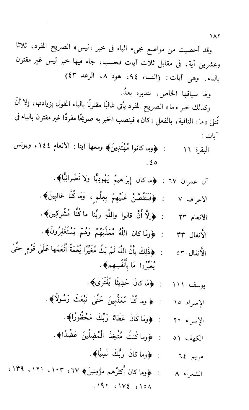 وقد أحصيت من مواضع مجيء الباء في خبر "ليس" الصريح المفرد، ثلاثا وعشرين آية، في مقابل ثلاث آيات فحسب، جاء فيها خبر ليس غير مقترن بالباء. وهي آيات: (النساء 94، هود 8، الرعد 43)