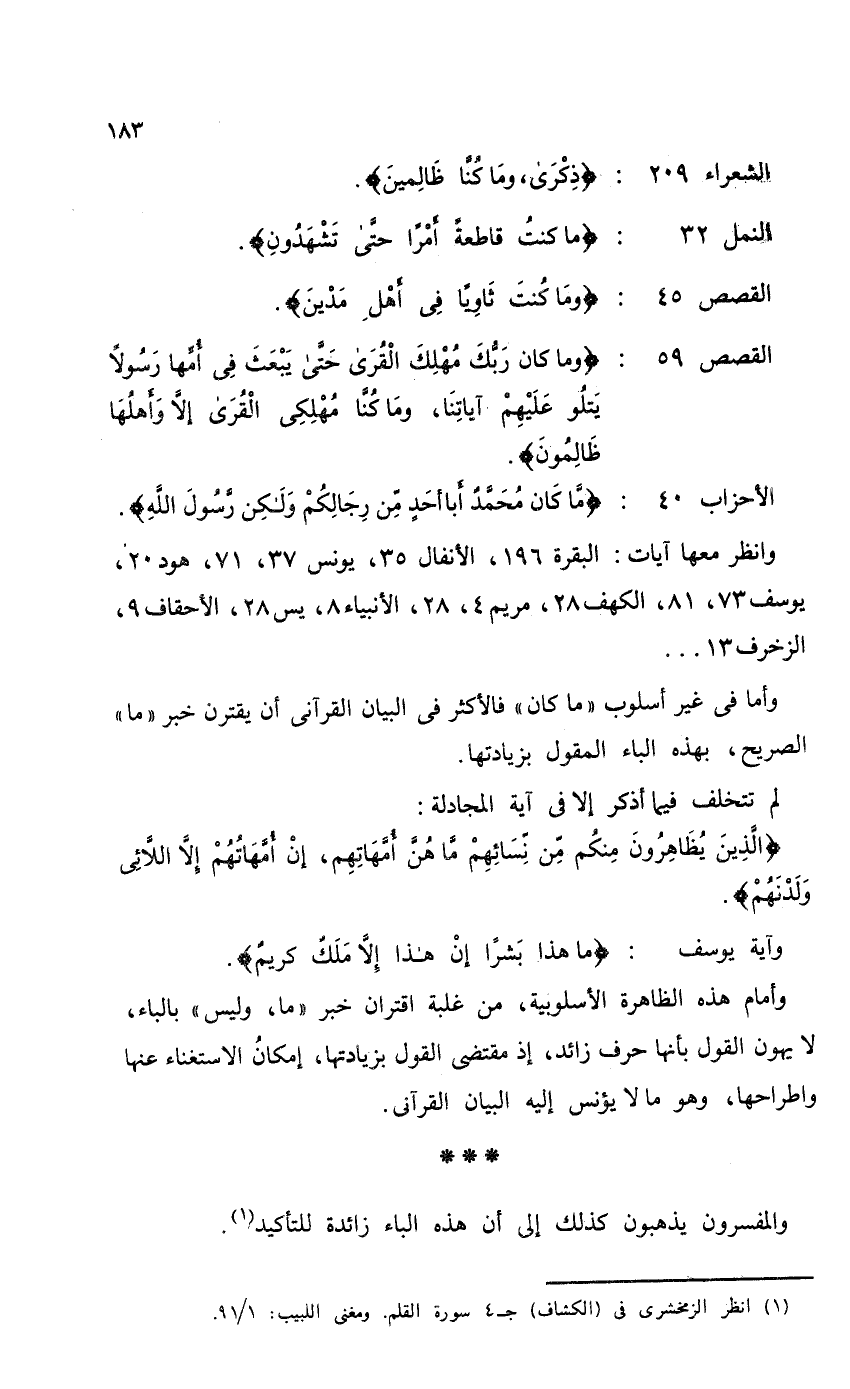 وأما هذه الظاهرة الأسلوبية، من غلبة اقتران خبر "ما، وليس" بالباء، لا يهون القول بأنها حرف زائد، إذ مقتضى القول بزيادتها، إمكان الاستغناء عنها واطراحها، وهو ما لا يؤنس إليه البيان القرآني.
