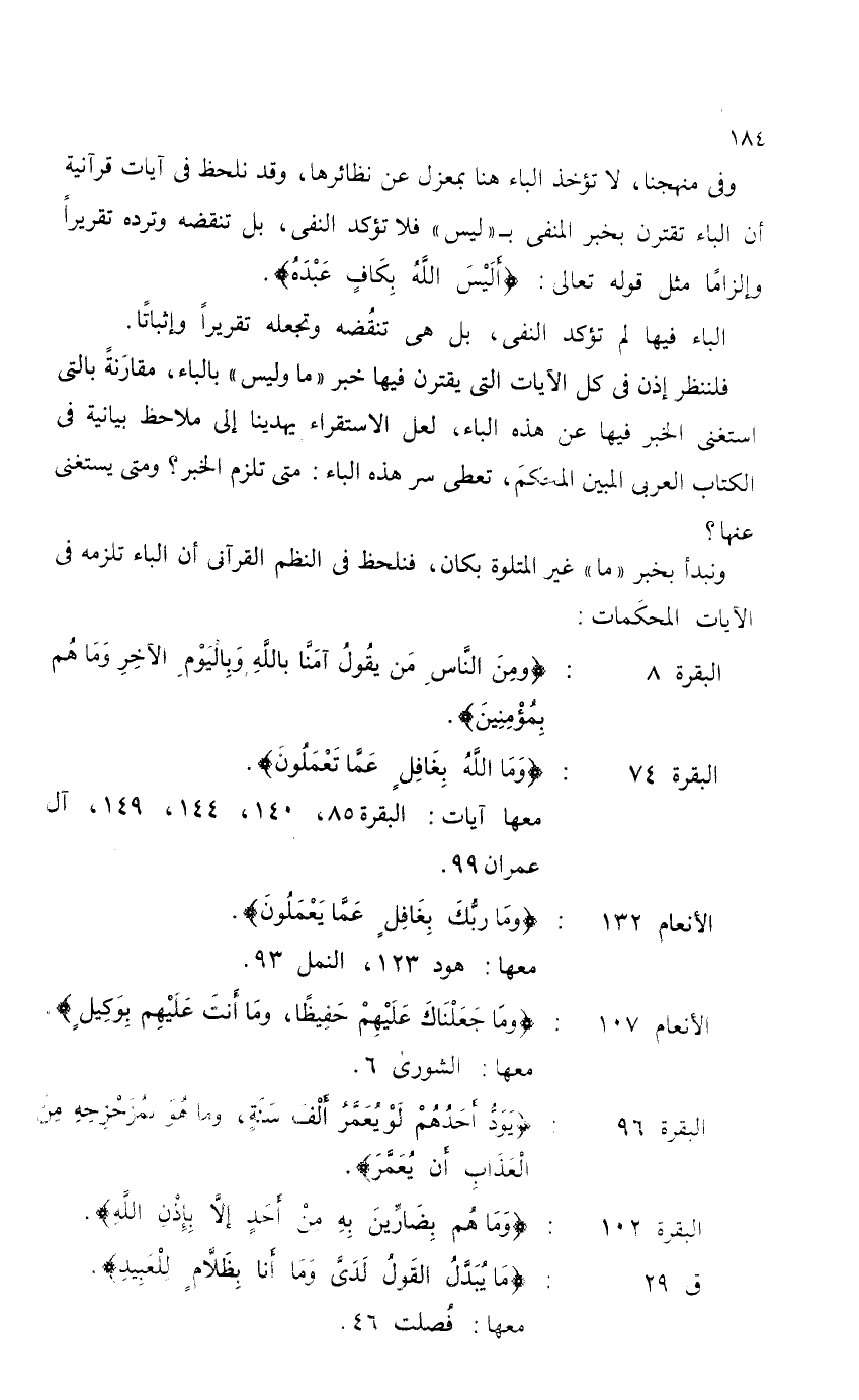وفي منهجنا، لا تؤخذ الباء هنا بمعزل عن نظائرها، وقد نلحظ في آيات قرآنية أن الباء تقترن بخبر المنفي بـ "ليس" فلا تؤكد النفي، بل تنقضه وترده تقريراً وإلزاماً مثل قوله تعالى: {أَلَيْسَ اللَّهُ بِكَافٍ عَبْدَهُ}