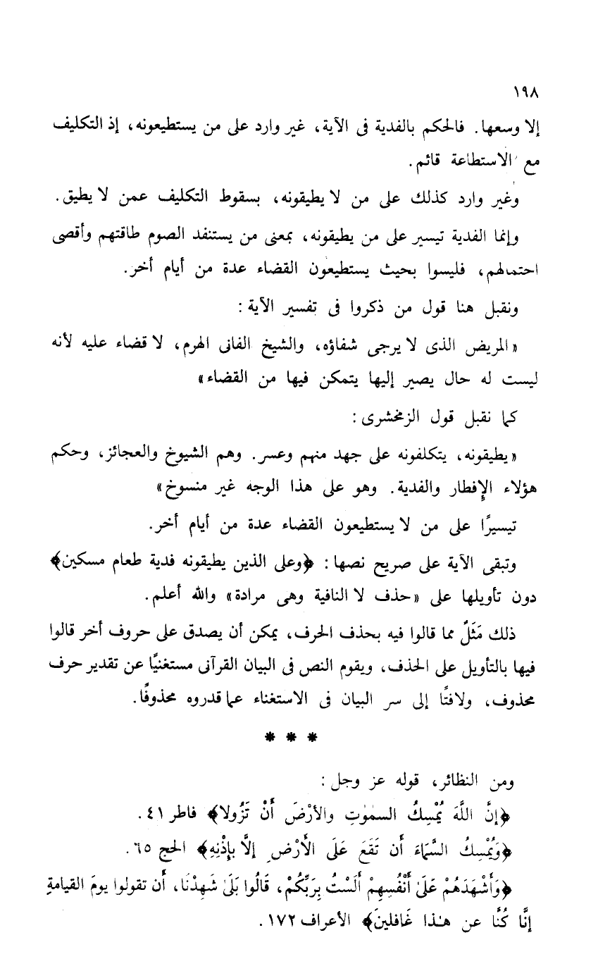 وتبقى الآية على صريح نصها: {وَعَلَى الَّذِينَ يُطِيقُونَهُ فِدْيَةٌ طَعَامُ مِسْكِينٍ} دون تأويلها على >حذف لا النافية وهي مرادة" والله أعلم.