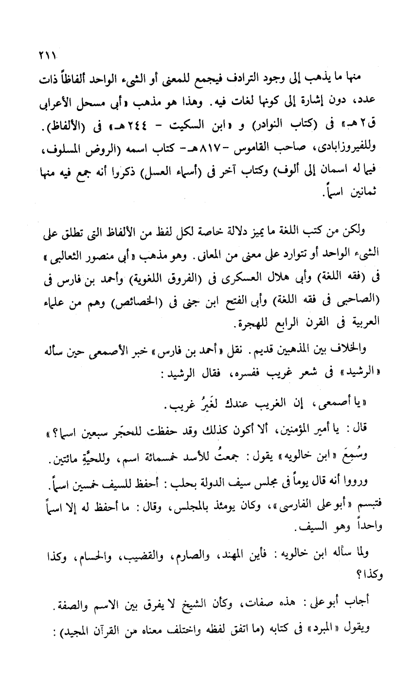 ولكن من كتب اللغة ما يميز دلالة خاصة لكل لفظ من الألفاظ التي تطلق على الشيء الواحد أو تتوارد على معنى من المعاني. وهو مذهب "أبي منصور الثعالبي" في (فقه اللغة) وأبي هلال العسكري في (الفروق اللغوية) وأحمد بن فارس في (الصاحبي في فقه اللغة) وأبي الفتح ابن جنى في (الخصائص) وهم من علماء العربية في القرن الرابع للهجرة.
