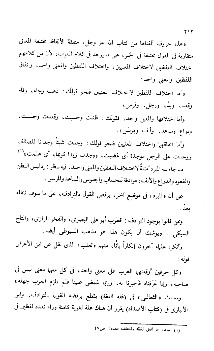 على أن "المبرد" في موضع آخر، يرفض القول بالترادف، على ما سوف ننقله بعدُ.