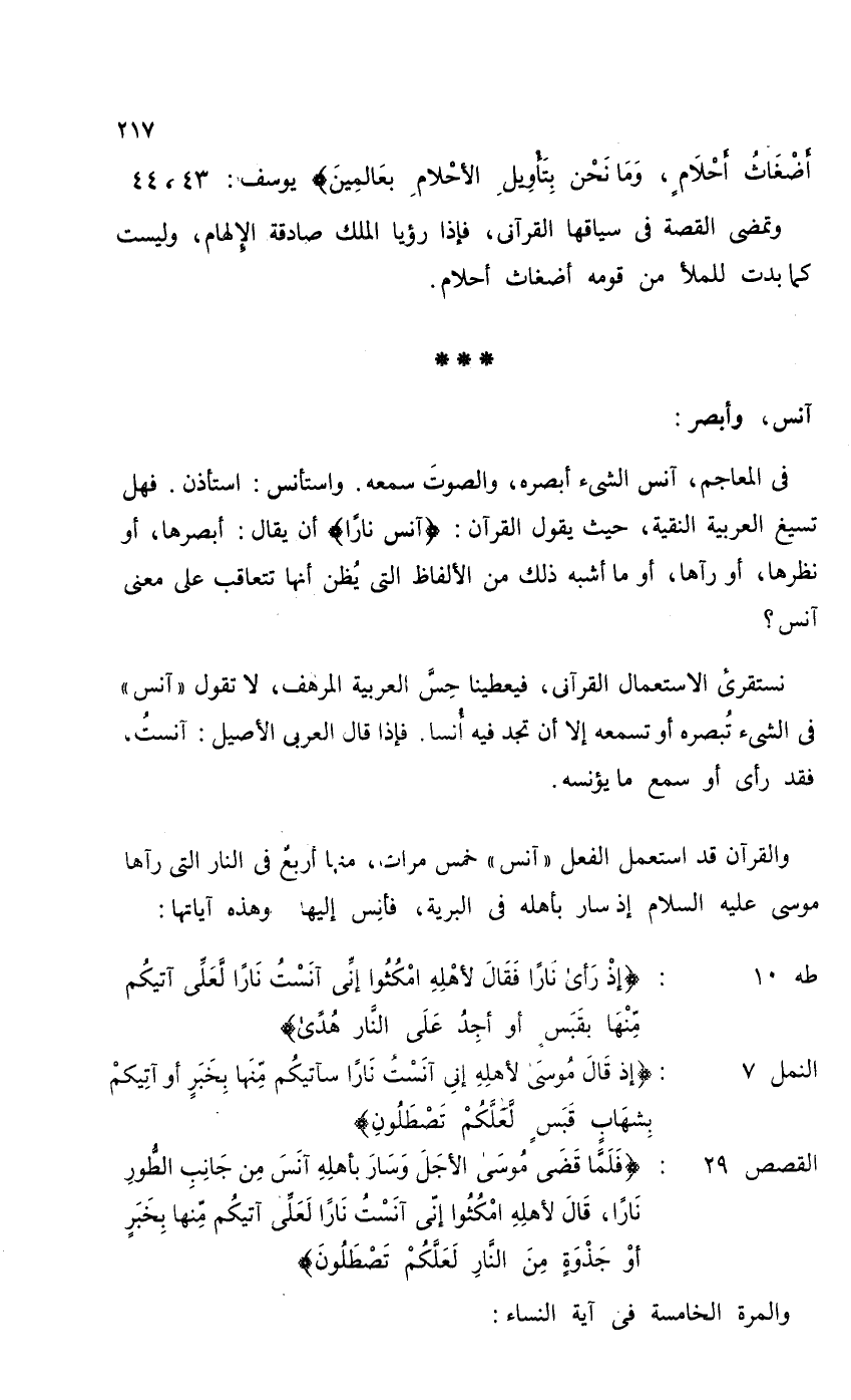 في المعاجم، آنس الشيء أبصره، والصوتَ سمعه. واستأنس: استأذن. فهل تسيغ العربية النقية، حيث يقول القرآن: {آنس ناراً} أن سقال: أبصرها، أو نظرها، أو رآها، أو ما أشبه ذلك من الألفاظ التي يُظن أنها تتعاقب على معنى آنس؟