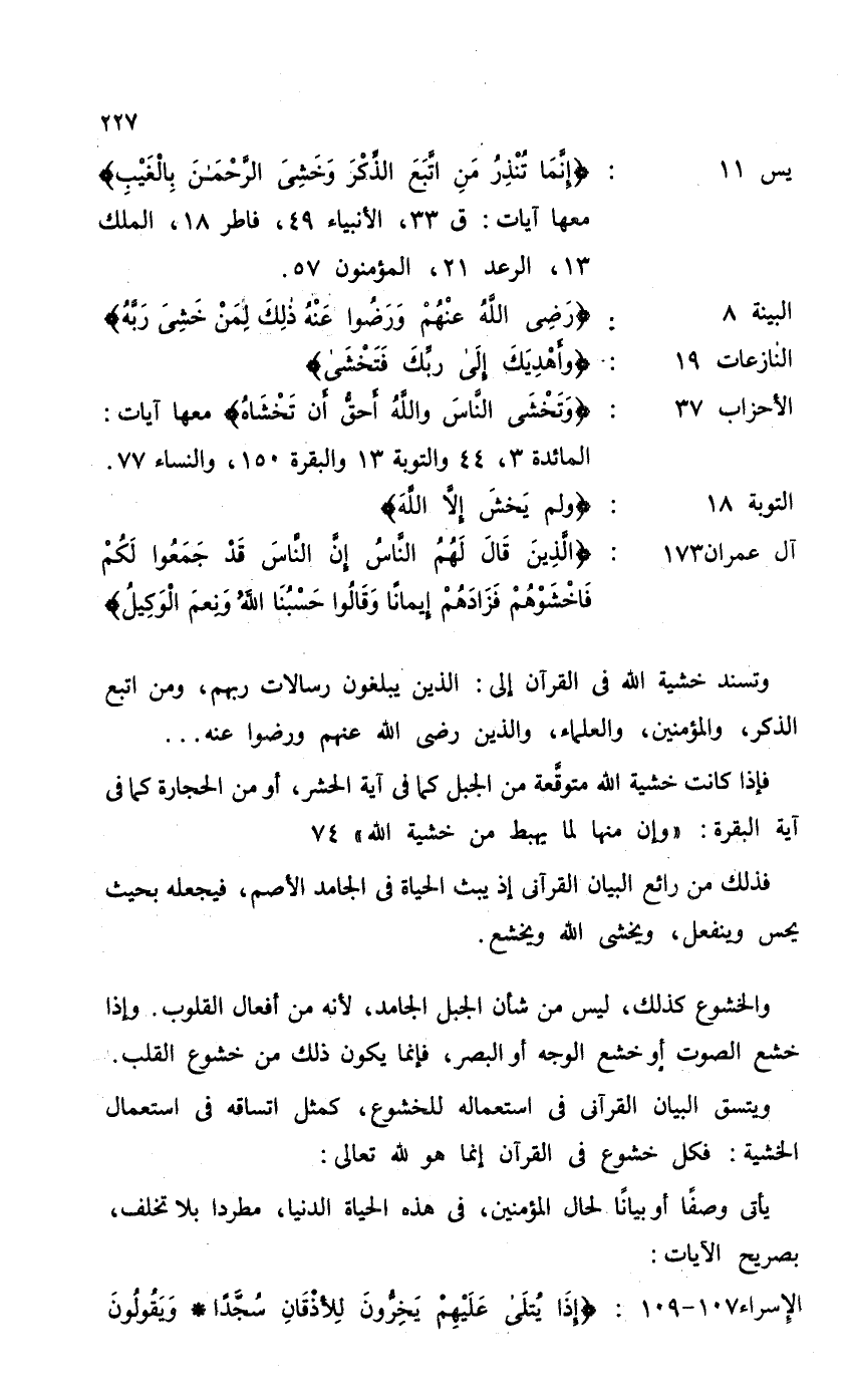 وتسند خشية الله في القرآن إلى: الذين يبلغون رسالات ربهم، ومن اتبع الذكر، والمؤمنين، والعلماء، والذين رضى الله عنهم ورضوا عنه. . .