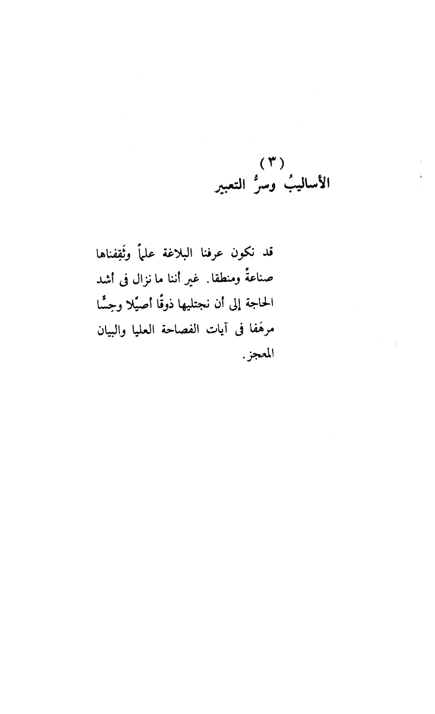 قد نكون عرفنا البلاغة علماً وثَقِفناها صناعةً ومنطقاً. غير أننا ما نزال في أشد الحاجة إلى أن نجتليها ذوقاً أصيلاً وحِساً مرهفاً في آيات الفصاحة العليا والبيان المعجز.