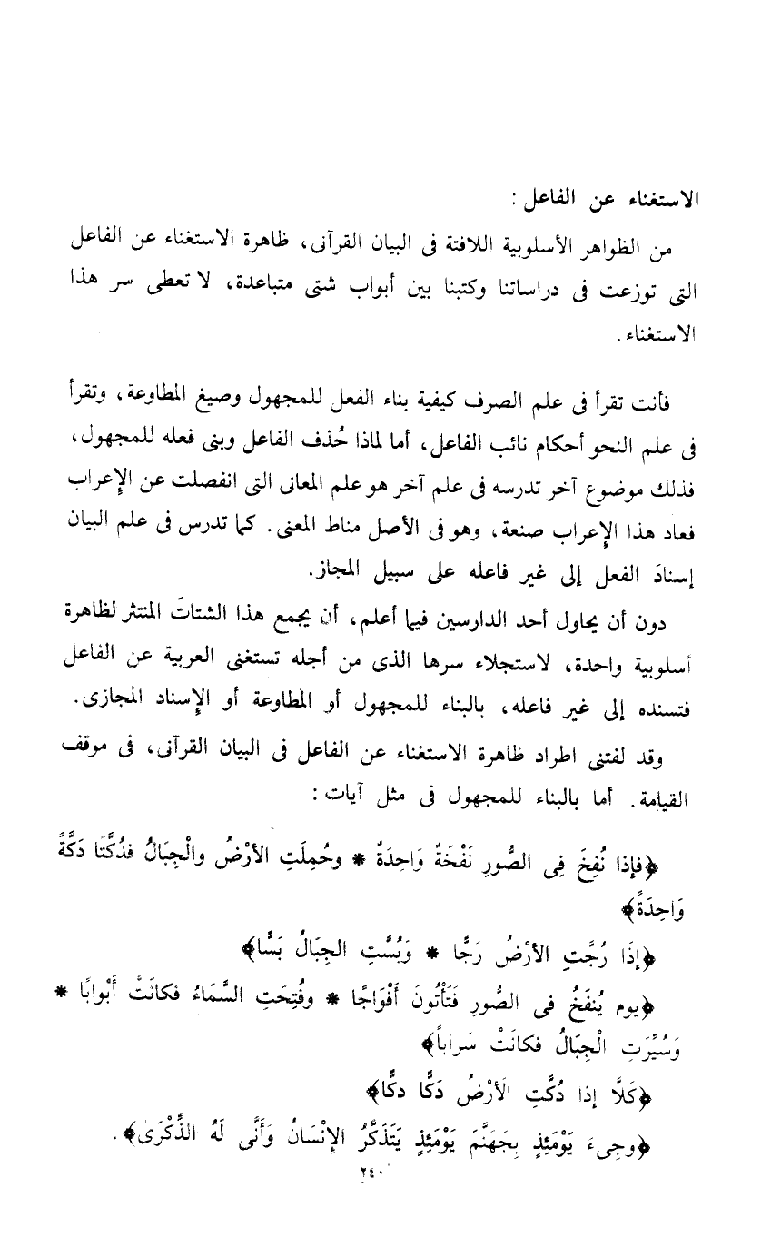 من الظواهر الأسلوبية اللافتة في البيان القرآني، ظاهرة الاستغناء عن الفاعل التي توزعت في دراستنا وكتبنا بين أبواب شتى متباعدة، لا تعطي سر هذا الاستغناء.