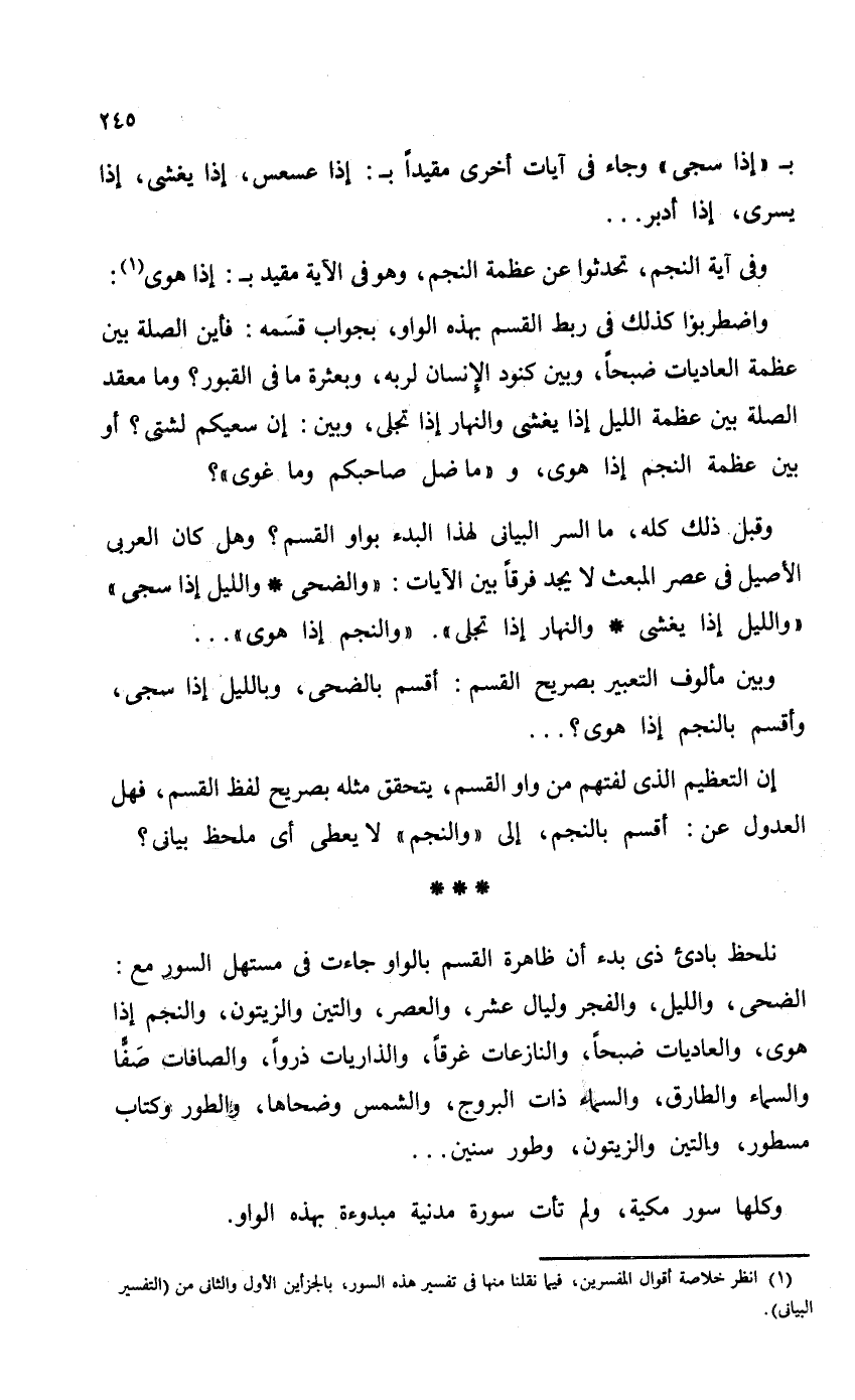 وقبل ذلك كله، ما السر البياني لهذا البدء بالواو القسم؟ وهل كان العربي الأصيل في عصر المبعث لا يجد فرقاً بين الآيات: {وَالضُّحَى (1) وَاللَّيْلِ إِذَا سَجَى} {وَاللَّيْلِ إِذَا يَغْشَى (1) وَالنَّهَارِ إِذَا تَجَلَّى} {وَالنَّجْمِ إِذَا هَوَى} . . .