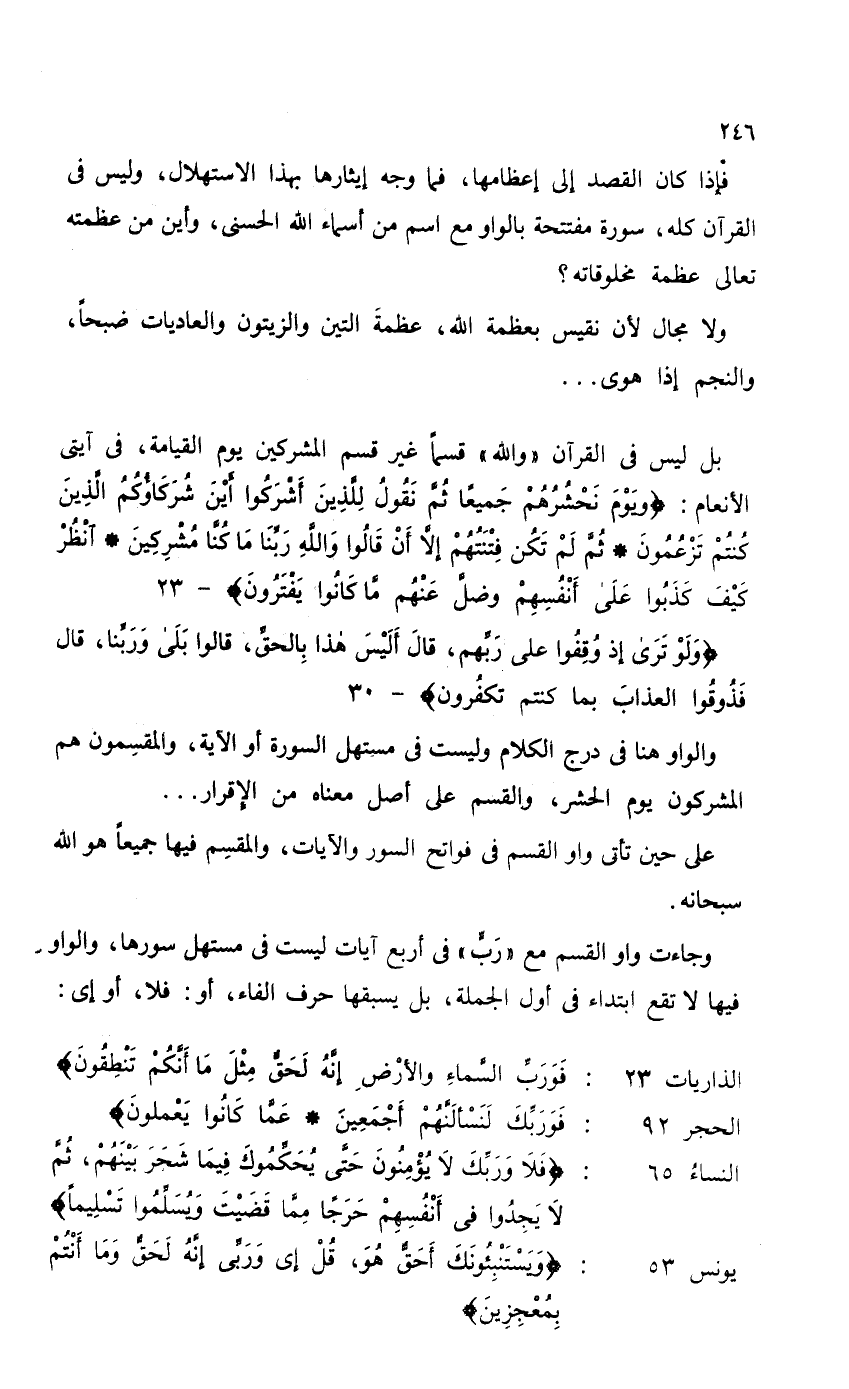 بل ليس في القرآن "والله" قسماً غير قسم المشركين يوم القيامة، في آيتى الأنعام: {وَيَوْمَ نَحْشُرُهُمْ جَمِيعًا ثُمَّ نَقُولُ لِلَّذِينَ أَشْرَكُوا أَيْنَ شُرَكَاؤُكُمُ الَّذِينَ كُنْتُمْ تَزْعُمُونَ (22) ثُمَّ لَمْ تَكُنْ فِتْنَتُهُمْ إِلَّا أَنْ قَالُوا وَاللَّهِ رَبِّنَا مَا كُنَّا مُشْرِكِينَ (23) انْظُرْ كَيْفَ كَذَبُوا عَلَى أَنْفُسِهِمْ وَضَلَّ عَنْهُمْ مَا كَانُوا يَفْتَرُونَ} - 23