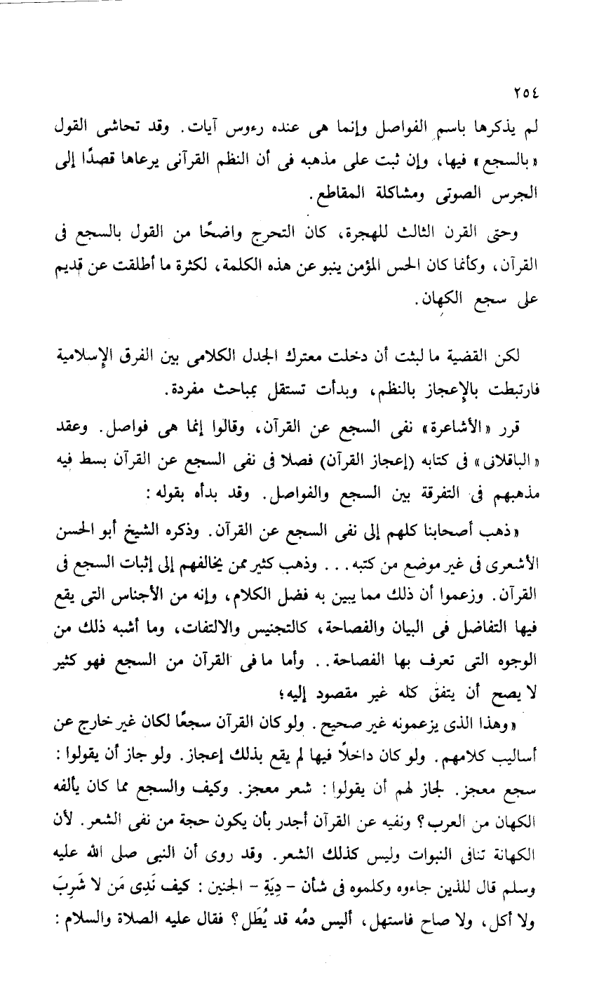 "وهذا الذي يزعمونه غير صحيح. ولو كان القرآن سجعاً لكان غير خارج عن أساليب كلامهم ولو كان داخلاً فيها لم يقع بذلك إعجاز. ولو جاز أن يقولوا: سجع معجز. لجاز لهم أن يقولوا: شعر معجز. وكيف والسجع مما كان يألفه الكهان من العرب؟ ونفيه عن القرآن أجدر بأن يكون حجة من نفي الشعر. لأن الكهانة تنافي النبوات وليس كذلك الشعر. وقد روى أن النبي - صلى الله عليه وسلم - قال للذين جاءوه وكلموه في شأن - دِيَةِ - الجنين: كيف نَدِى مَن لا شَرِبَ ولا أكل، ولا صاح فاستهل، أليس دمُه قد يُطَل؟ فقال عليه الصلاة والسلام: