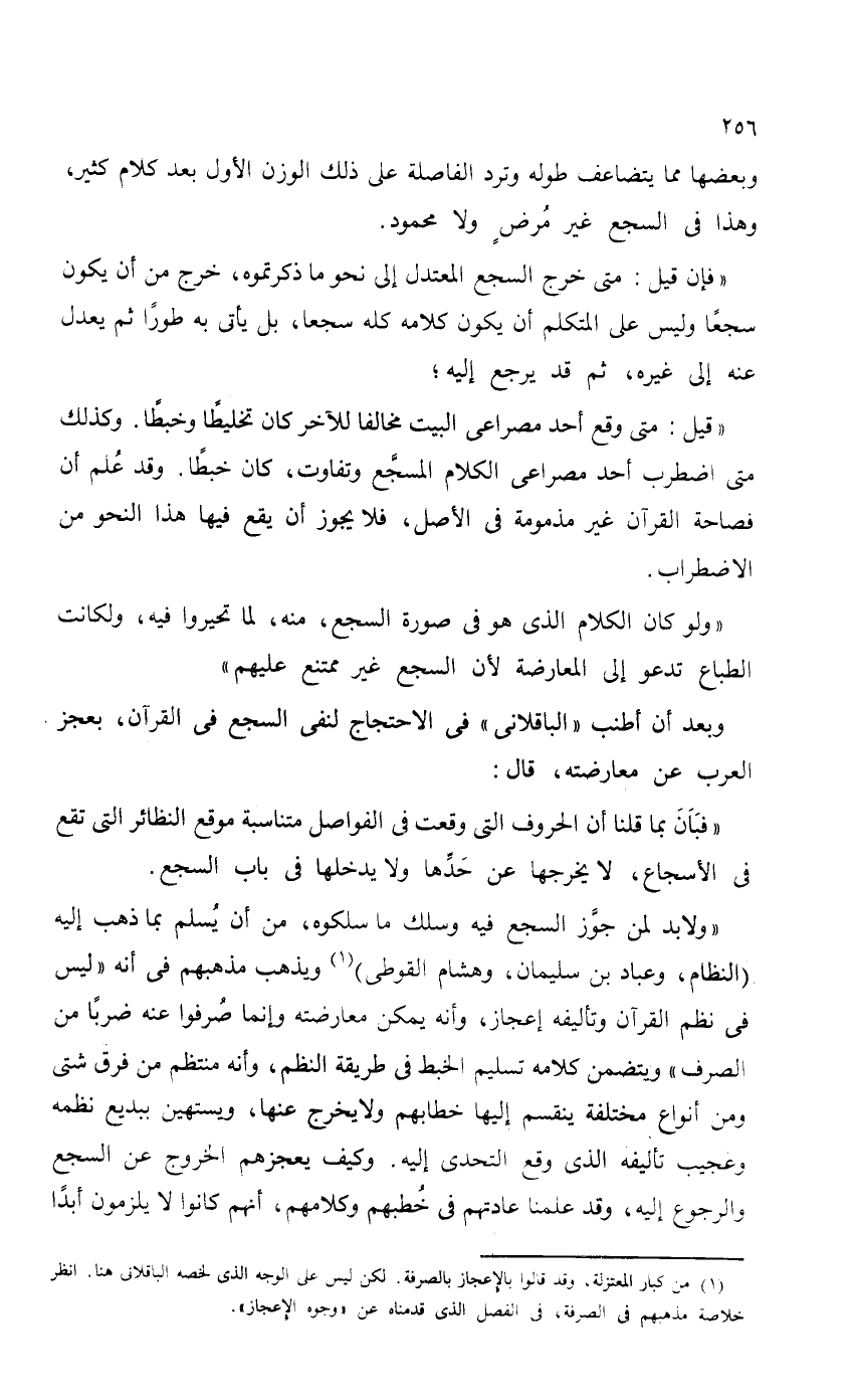 "ولابد لمن جوَّز السجع فيه وسلك ما سلكوه، من أن يُسلم بما ذهب إليه (النظام، وعباد بن سليمان، وهشام القوطي) ويذهب مذهبهم في أنه "ليس في نظم القرآن وتأليفه إعجاز، وأنه يمكن مع معارضته وإنما صُرفوا عنه ضرباً من الصرف" ويتشمن كلامه تسليم الخبط في طريقة النظم، وأنه منتظم من فرق شتى ومن أنواع مختلفة ينقسم إليها خطابهم ولا يخرج عنها، ويستهين ببديع نظمه وعجيب تأليفه الذي وقع التحدي إليه. وكيف يعجزهم الخروج عن السجع والرجوع إليه، وقد علمنا عادتهم في خُطبهم وكلامهم، أنهم كانوا لا يلزمون أبداً