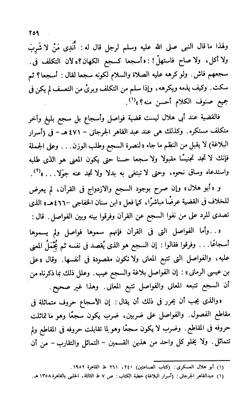 فالقضية عند أبي هلال ليست قضية فواصل واسجاع بل سجع بليغ وآخر متكلف مستكره. وكذلك هي عند عبد القاهر الجرجاني - 471 هـ - في (أسرار البلاغة) لا يقبل من النظم ما جاء "لنصرة السجع وطلب الوزن. . . وعلى الجملة فإنك لا تجد تجنيساًَ مقبولاً ولا سجعاً حسنا حتى يكون المعنى هو الذي طلبه واستدعاه وساق نحوه، وحتى لا تبتغي به بدلاً ولا تدج عنه حِوَلا. . . ".