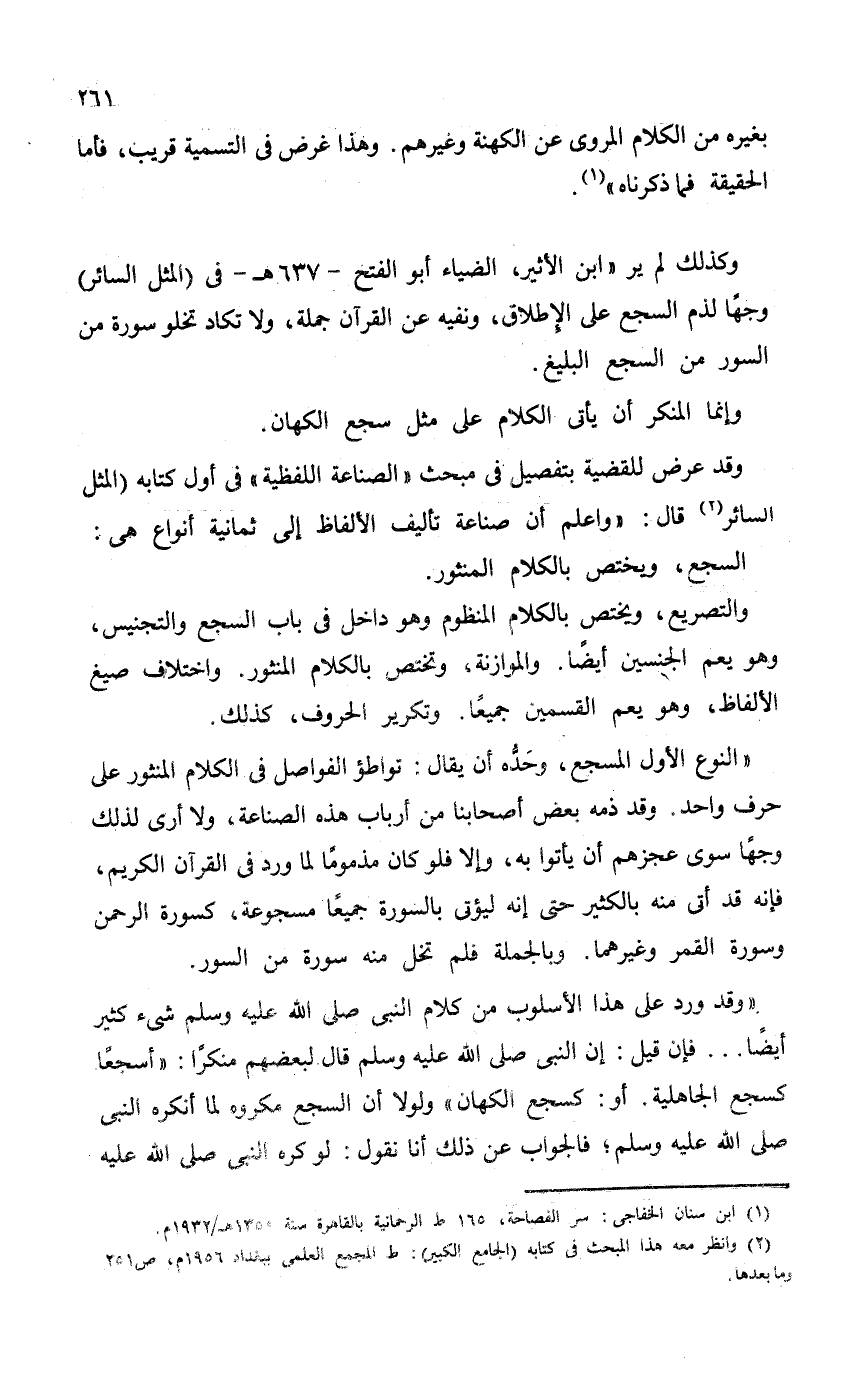"وقد ورد على هذا الأسلوب من كلام النبي - صلى الله عليه وسلم - شيء كثير أيضاً. . . فإن قيل: إن النبي - صلى الله عليه وسلم - قال لبعضهم منكراً: "أسجعاً كسجع الجاهلية. أو" كسجع الكهان" ولولا أن السجع مكروه لما أنكره النبي - صلى الله عليه وسلم -، فالجواب عن ذلك أنا نقول: لو كره النبي - صلى الله عليه