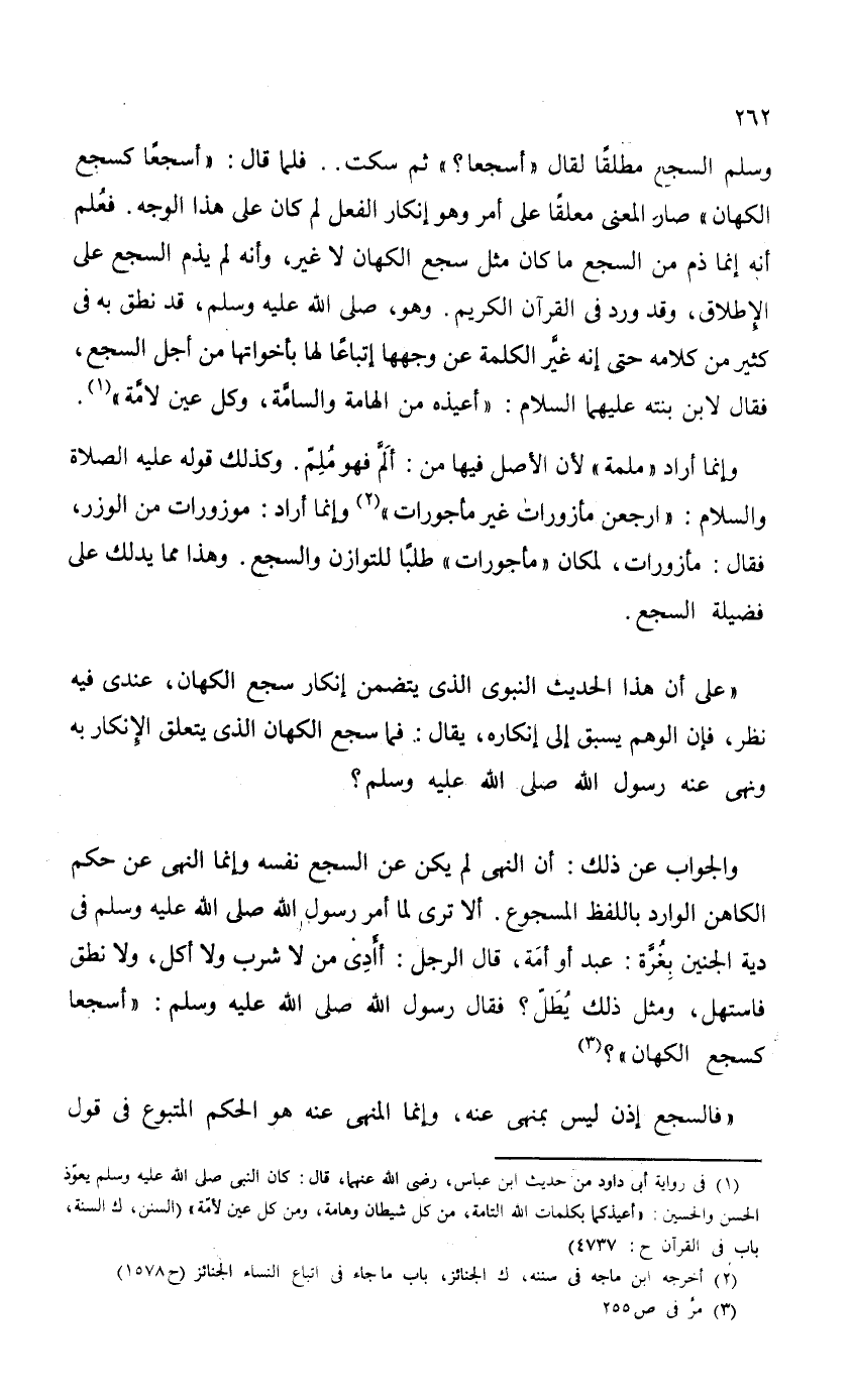 "على أن هذا الحديث النبوي الذي يتضمن إنكار سجع الكهان، عندي فيه نظر، فإن الوهم يسبق إلى إنكاره، يقال: فما سجع الكهان الذي يتعلق الإنكار به ونهى عنه رسول الله - صلى الله عليه وسلم -؟