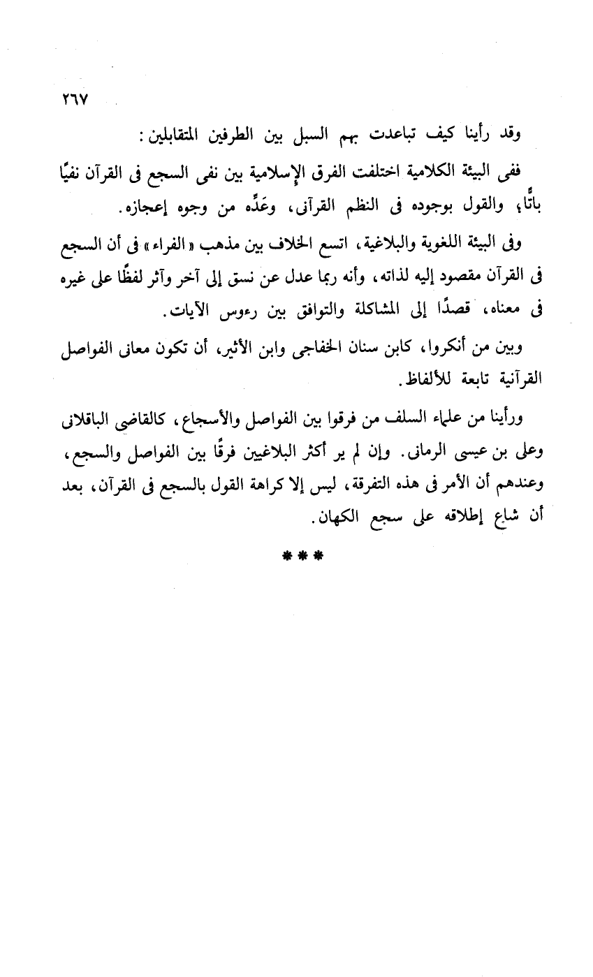 وفي البيئة اللغوية والبلاغية، اتسع الخلاف بين مذهب "الفراء" في أن السجع في القرآن مقصود إليه لذاته، وأنه ربما عدل عن نسق إلى آخر وآثر لفظاً على غيره في معناه، قصداً إلى المشاكلة والتوافق بين رءوس الآيات.