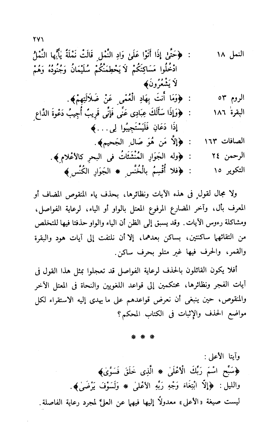 ولا مجال لقولٍ في هذه الآيات ونظائرها، بحذف ياء المنقوص المضتف أو المعروف بال، وآخر المضارع المرفوع المعتل بالواو أو الياءـ لرعاية الفواصل، ومشاكلة رءوس الآيات, وقد يسبق إلى الظن أن الياء والواو حذفتا فيها للتخلص من التقائهما ساكنتين، بساكن بعدهما، إلا أن نلتفت إلى آيات هود والبقرة والقمر، والحرف فيها غير متلو بحرف ساكن.
