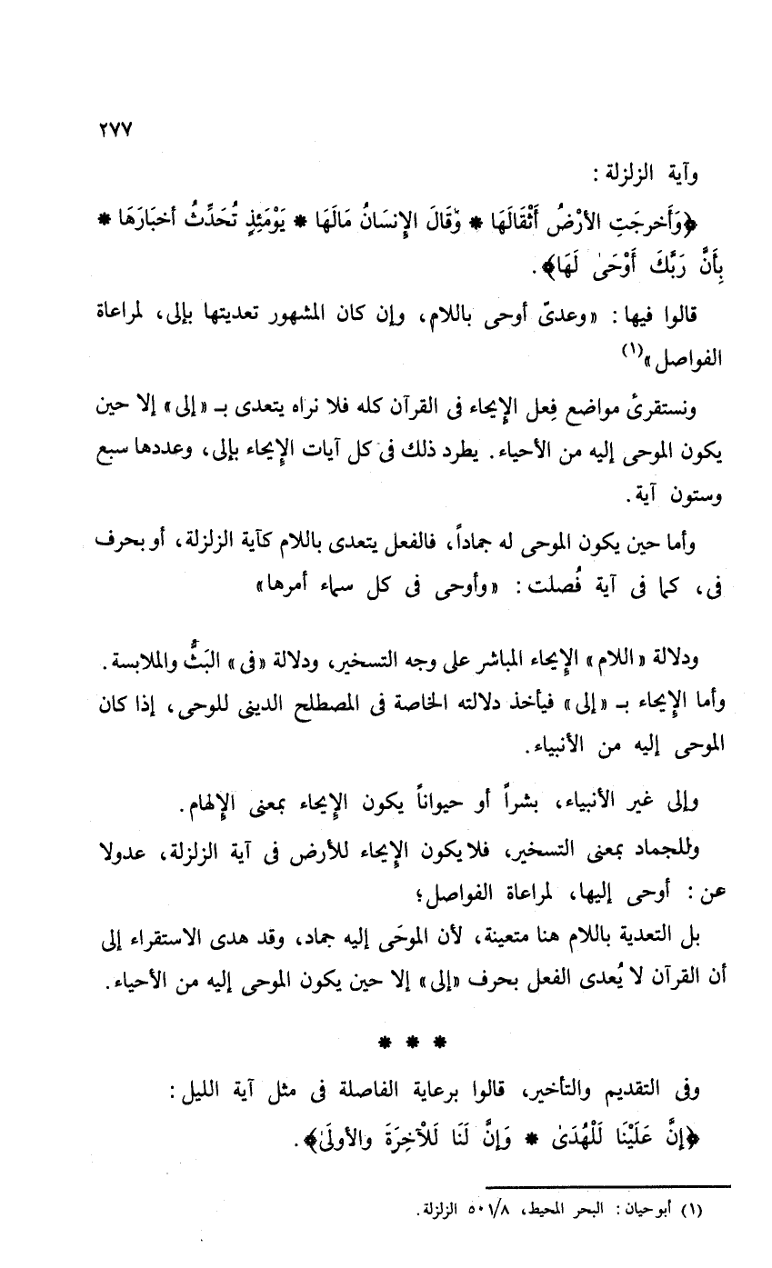 وللجماد بمعنى التسخير، فلا يكون للأرض في آية الزلزة، عدولاً عن: أوحى إليها، لمراعاة الفواصل،