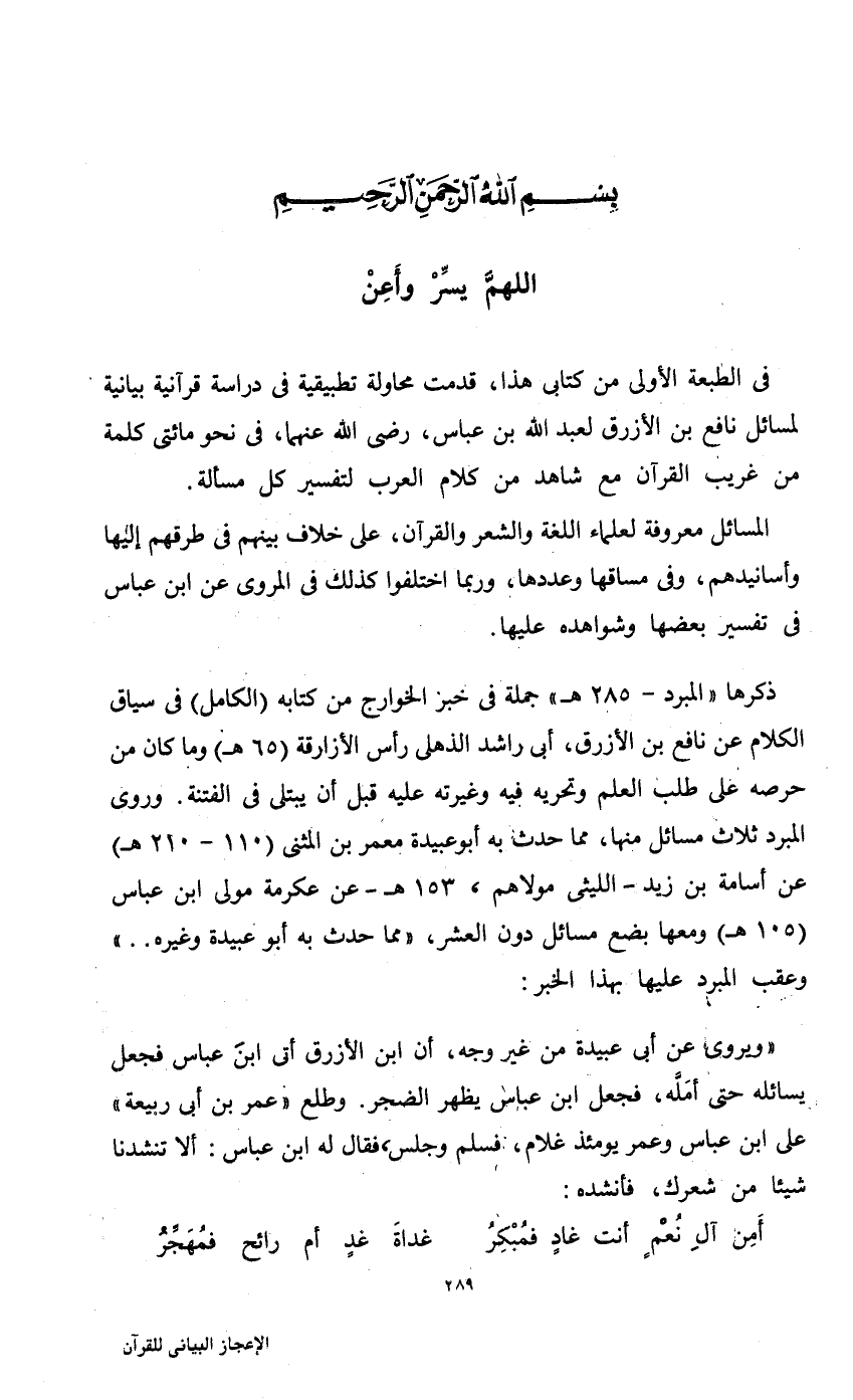 في الطبعة الأولى من كتابي هذا، قدمت محاولة تطبيقية في دراسة قرآنية بيانية لمسائل نافع بن الأزرق لعبد الله بن عباس - رضي الله عنهما -، في نحو مائتى كلمة من غريب القرآن مع شاهد من كلام العرب لتفسير كل مسألة.