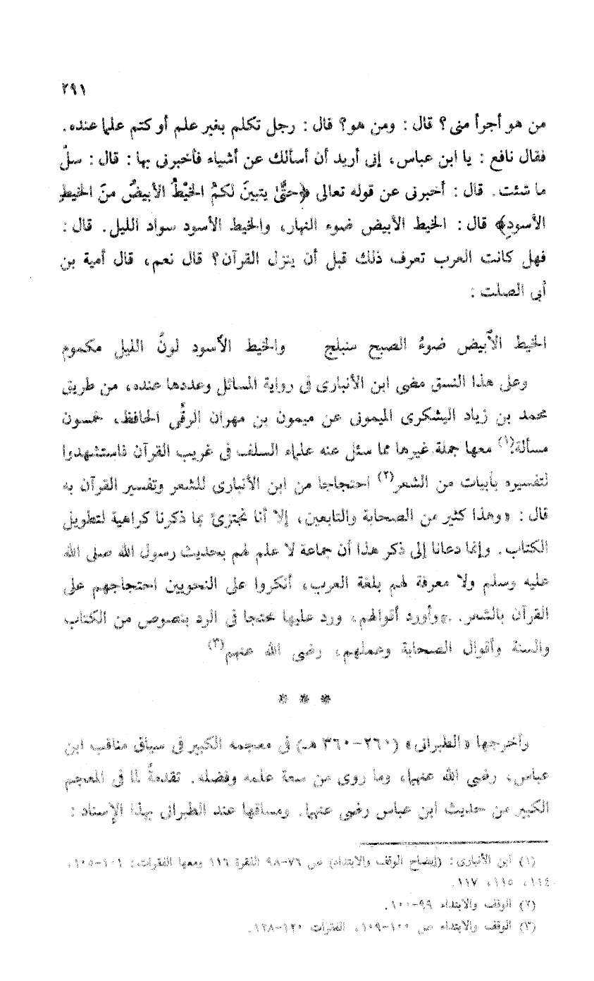 من هو أجرأ مني؟ قال: ومن هو؟ قال: رجل تكلم بغير علم أو كتم علماً عنده. فقال نافع: يا ابن عباس، إني أريد أن أسألك عن أشياء فأخبرني بها: قال: سلْ ما شئت. قال: أخبرني عن قوله تعالى {حَتَّى يَتَبَيَّنَ لَكُمُ الْخَيْطُ الْأَبْيَضُ مِنَ الْخَيْطِ الْأَسْوَدِ} قال: الخيط الأبيض ضوء النهار، والخيط الأسود سواد الليل. قال: فهل كانت العرب تعرف ذلك من قبل أن ينزل القرآن؟ قال نعم، قال أمية بن أبي الصلت: