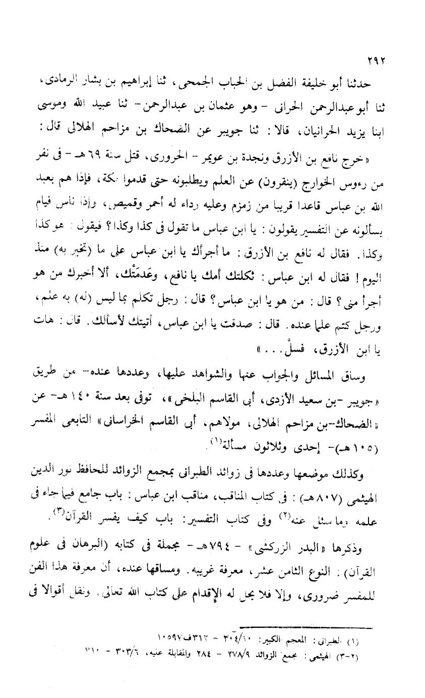 حدثنا أبو خليفة الفضل بن الحباب الجمحي، ثنا إبراهيم بن بشار الرمادي، ثنا أبو عبد الرحمن الحراني - وهو عثمان بن عبد الرحمن - ثنا عبيد الله موسى ابنا يزيد الحرانيان، قالا: ثنا جويبر عن الضحاك بن مزاحم الهلالي قال: "خرج نافع بن الأزرق ونجدة بن عويمر - الحرورى، قتل سنة 69 هـ في نفر من رءوس الخوارج (ينقرون) عن العلم ويطلبونه حتى قدموا مكة، فأذ هم بعبد الله بن عباس قاعداً قريباً من زمزم وعليه رداء له أحمر وقميص، وإذا ناس قيام يسألونه عن التفسير يقولون: يا ابن عباس ما تقول في كذا وكذا؟ فيقول: هو كذا وكذا. فقال له نافع بن الأزرق: ما أجرأك يا ابن عباس على ما (تخير به) منذ اليوم! فقال له ابن عباس: ثكلتك أمك يا نافع، وعَدمَتْك، ألا أخبرك من هو أجرأ مني؟ قال: من هو يا ابن عباس؟ قال: رجل تكلم بما ليس (له) به علم، ورجل كتم علماً عنده. قال: صدقت با ابن عباس، أتيتك لأسالك. وقال: هات يا اين الأزرق، فسلْ.."