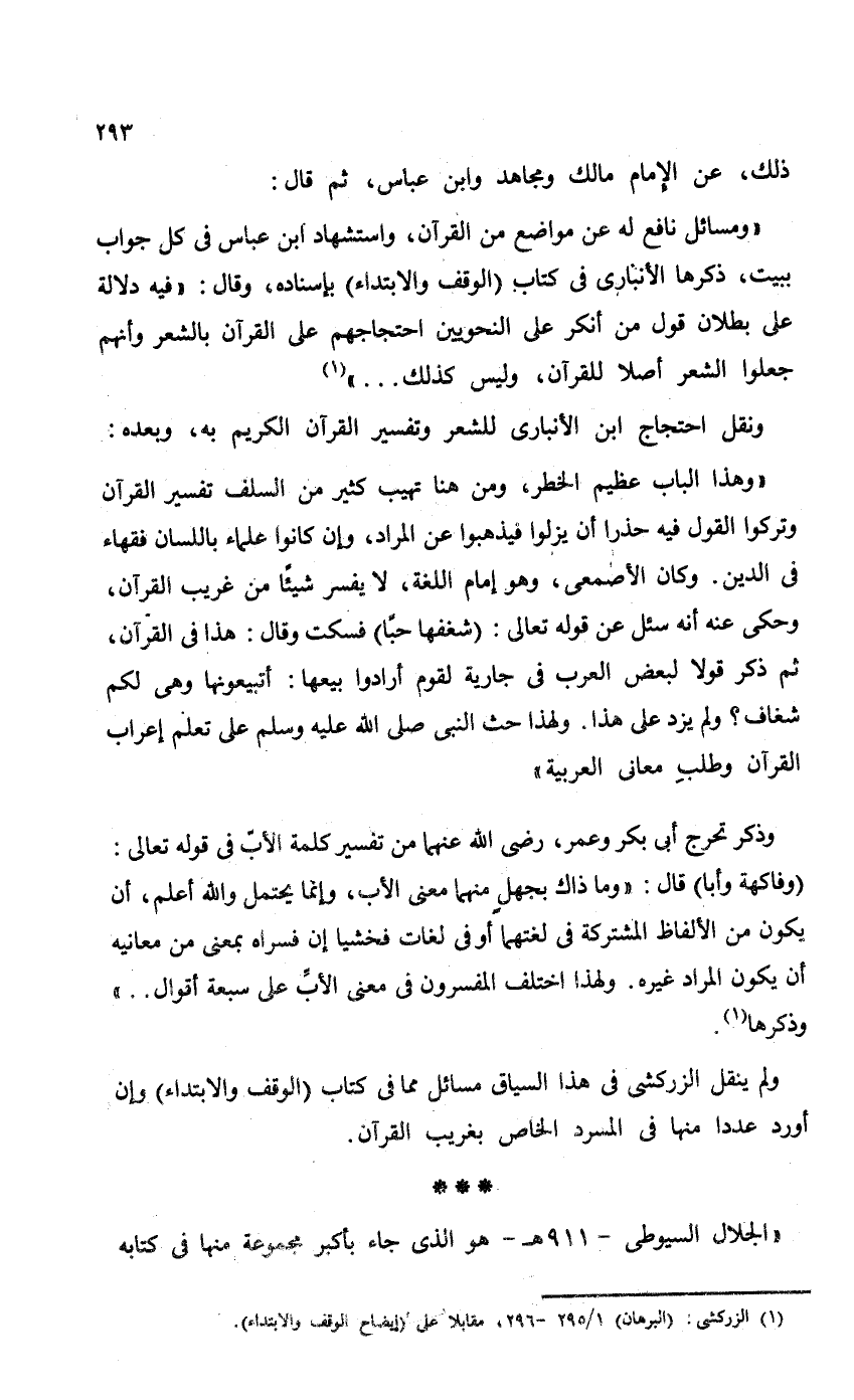 ونقل احتجاج ابن الأنباري للشعر وتفسير القرآن الكريم به، وبعده: "وهذا الباب عظيم الخطر، ومن هنا تهيب كثير من السلف تفسير القرآن وتركوا القول فيد حذراً أن يزلوا فيذهبوا عن المراد، وإن كانوا علماء باللسان فقهاء في الدين. وكان الأصمعي، وهو إمام اللغة، لا يفسر شيئاً من غريب القرآن، وحكى عنه أنه سئل عن قوله تعالى: {شَغَفَهَا حُبًّا} فسكت وقال: هذا في القرآن، ثم ذكر قولاً لبعض العرب في جارية لقوم أرادوا بيعها: أتبيعونها وهي لكم شغاف؟ ولم يزد على هذا. ولهذا حث النبي - صلى الله عليه وسلم - على تعلم إعراب القرآن وطلبِ معاني العربية"