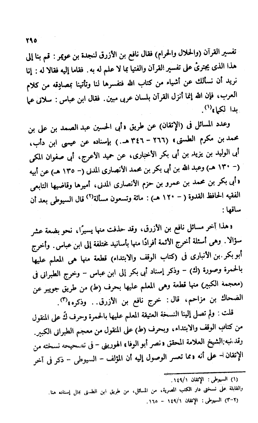 "هذا آخر مسائل نافع بن الأزرق، وقد حذفت منها يسيراً، نحو بضعة عشر سؤالاً. وهي أسئلة أخرج الأئمة أفراداً منها بأسانيد مختلفة إلى ابن عباس. وأخرج أبو بكر بن الأنباري في (كتاب الوقف والابتداء) قطعة منها هي المعلم عليها بالحمرة وصورة (ك) - وذكر إسناد أبي بكر إلى ابن عباس - وخرج الطبراني في (معجمه الكبير) منه قطعة وهي المعلم عليها بحرف (ط) من طريق جويبر عن الضحاك بن مزاحم، قال: خرج نافع بن الأزرق. . . وذكره".