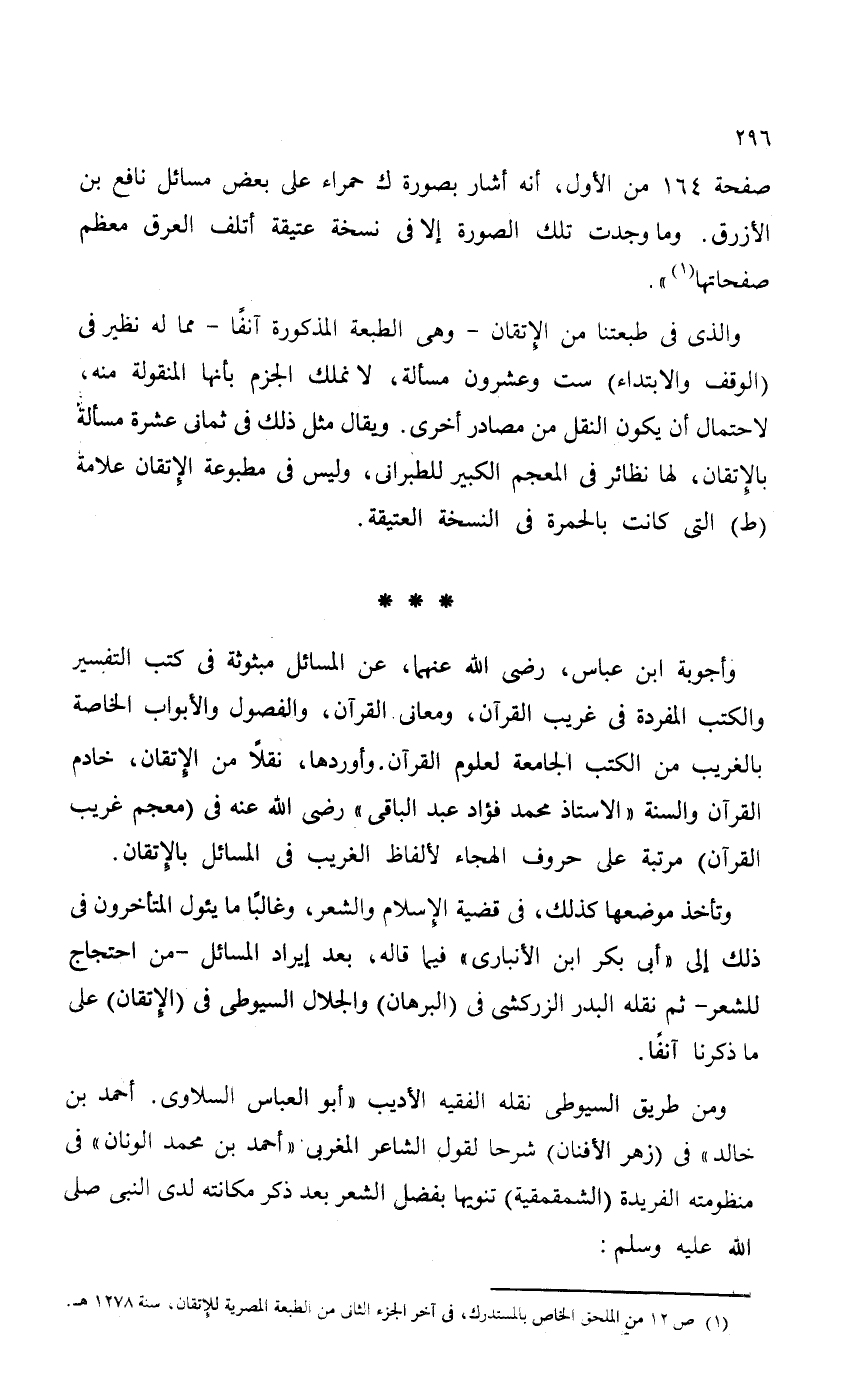 صفحة 164 من الأول، أنه أشار بصورة ك حمراء على بعض مسائل نافع بن الأزرق. وما وجدت تلك الصورة إلا في نسخة عتيقة أتلف العرق معظم صفحاتها".