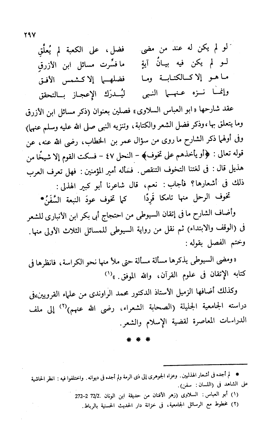 عقد شارحها "أبو العباس السلاوي" فصلين بعنوان (ذكر مسائل ابن الأزرق وما يتعلق بها، وذكر فضل الشعر والكتابة، وتنزية النبي - صلى الله عليه وسلم - عنهما) وفي أولهما ذكر الشارح ما روى من سؤال عمر بن الخطاب - رضي الله عنه -، عن قةله تعالى: {أَوْ يَأْخُذَهُمْ عَلَى تَخَوُّفٍ} - النحل 47 - فسكت القوم إلا شيخاً من هذيل قال: في لغتنا التخوف التنقص. فسأله أمير المؤمنين: فهل تعرف العرب ذلك في أشعارها؟ فأجاب: نعم، قال شاعرنا أبو كبير الهذلي: