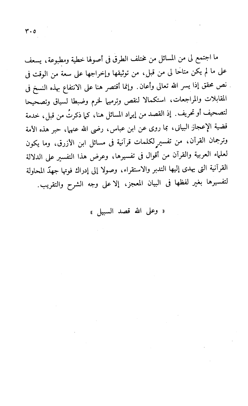 ما اجتمع لي من المسائل من مختلف الطرق في أصولها خطية ومطبوعة، يسعف على ما لم يكن متاحاً لي من قبل، من توثيقها وإخراجها على سعة من الوقت في نص محقق إذا يسر الله تعالى وأعان. وإنما أقتصر هنا على الانتفاع بهذه النسخ في المقابلات والمراجعات، استكمالاً لنقص وترميماً لخرم وضبطا لسياق وتصحيحاً لتصحيف أو تحريف. إذ القصد من إيراد المسائل هنا، كما ذكرتُ من قبل، خدمة قضية الإعجاز البياني، بما روى عن ابن عباس، - رضي الله عنهما -، حبر هذه الأمة وترجمان القرآن، من تفسيرٍ لكلمات قرآنية في مسائل ابن الأزرق، وما يكون لعلماء العربية والقرآن من أقوال في تفسيرها، وعرض هذا التفسير على الدلالة القرآنية التي يهدى إليها التدبر والاستقراء، وصولا إلى إدراك فوتها جهدَ المحاولة لتفسيرها بغير لفظها في البيان المعحز، إلا على وجه الشلرح والتقريب.