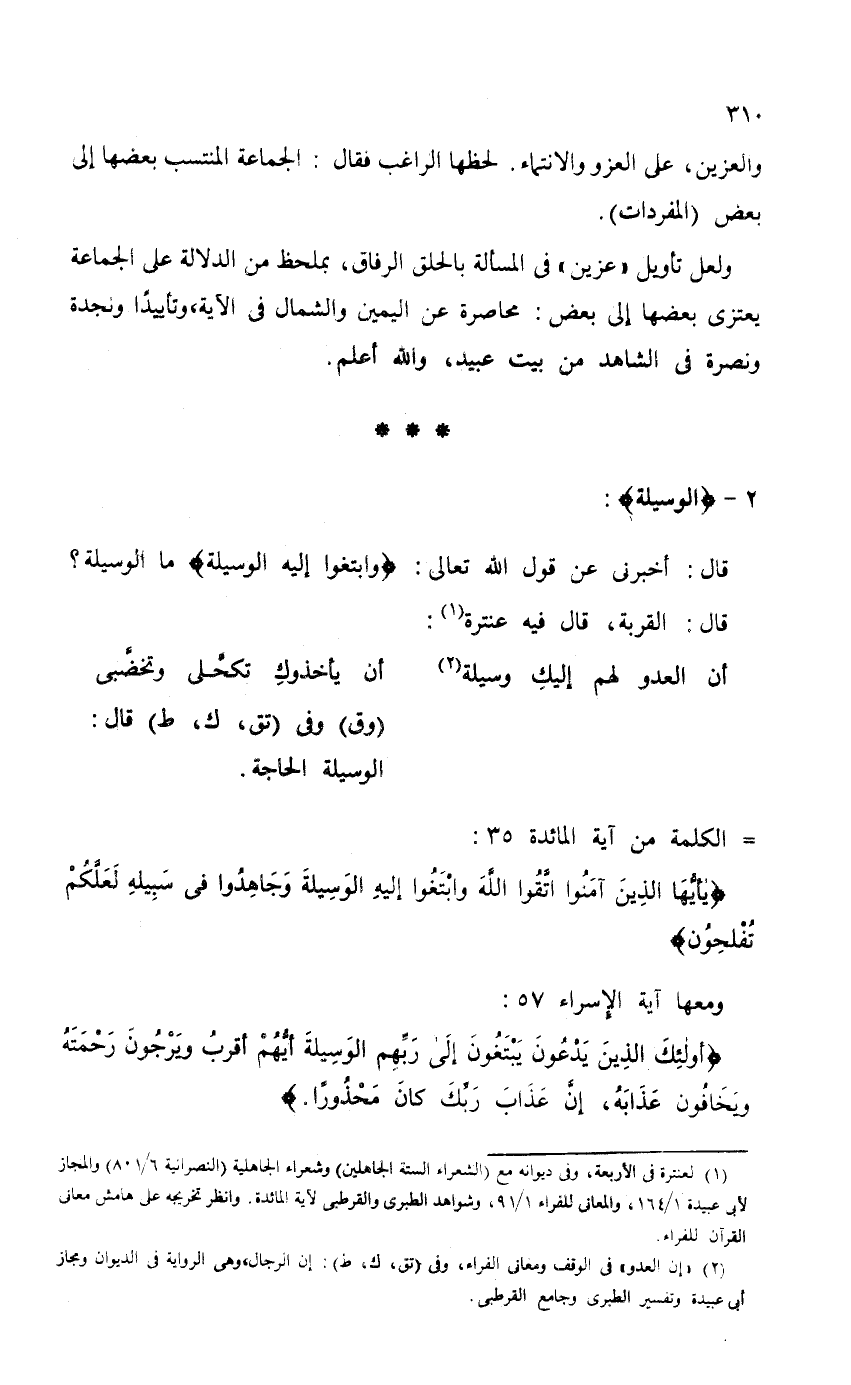 ولعل تأويل "عزين" في المسألة بالحق الرفاق، بملحظ من الدلالة على الجماعة يعتزى بعضها إلى بعض: محاصرة عن اليمين والشمال في الآية، وتأييداً ونجدة ونصره في الشاهد من بيت عبيد، والله أعلم.