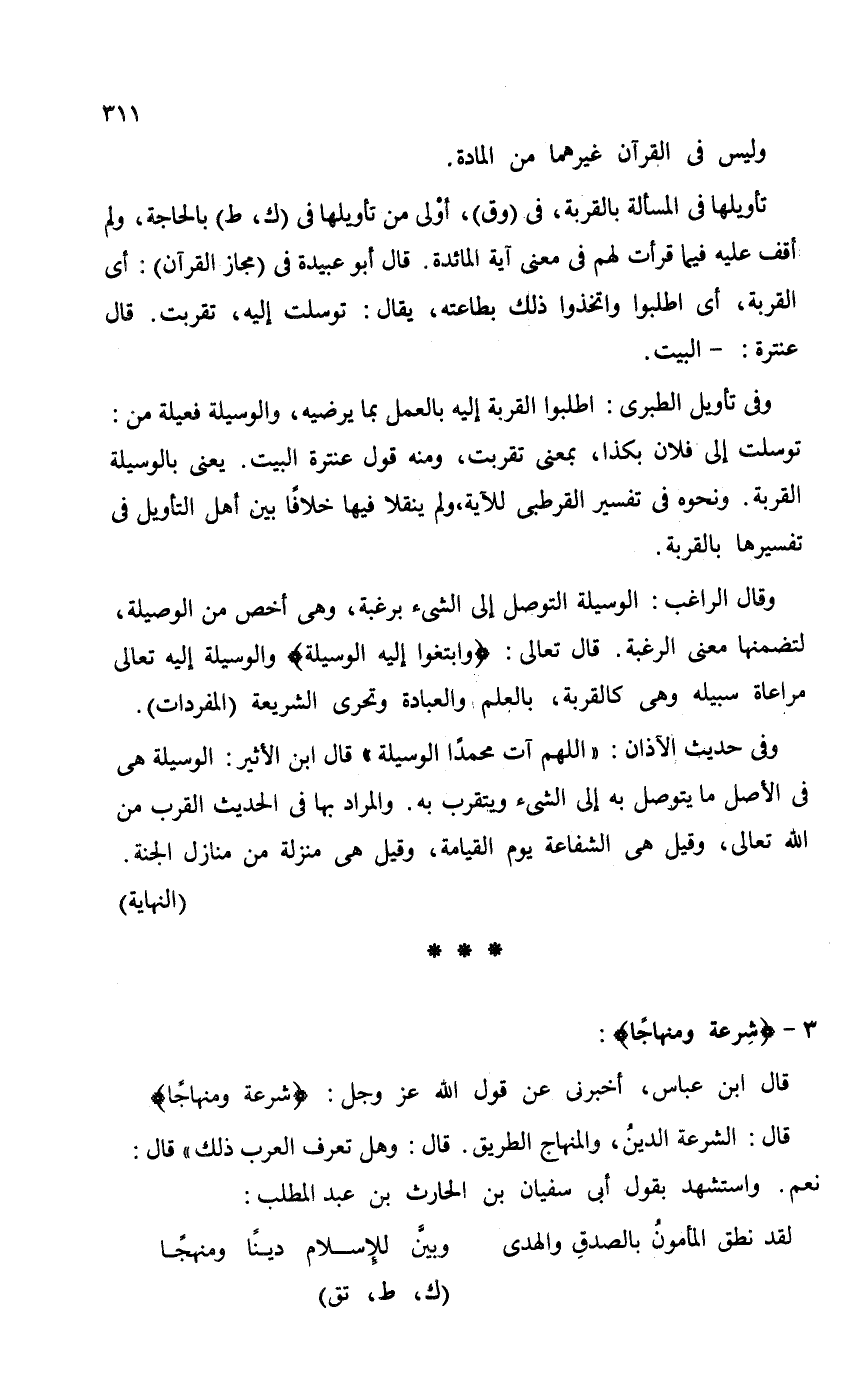 قال ابن عباس، أخبرني عن قول الله - عز وجل -: {شِرْعَةً وَمِنْهَاجًا} قال: الشرعة الدينُ، والمنهاج الطريق. قال: زهل تعرف العرب ذلك" قال: نعم. واستشهد بقول أبي سفيان بن الحارث بن عبد المطلب: