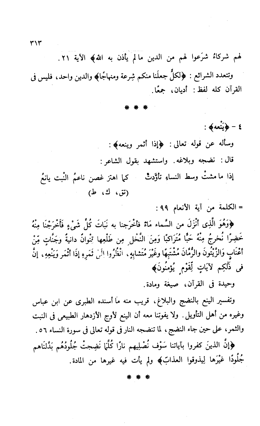 وتفسير الينع بالنضج والبلاغ، قريب منه ما أسنده الطبري عن ابن عباس وغيره من أهل التأويل. ولا يفوتنا معه أن الينع لأوج الأزدهار الطبيعي في النبت والثمر، على حين جاء النضج، لما تنضجه النار في قوله تعالى في سورة النساء 56.