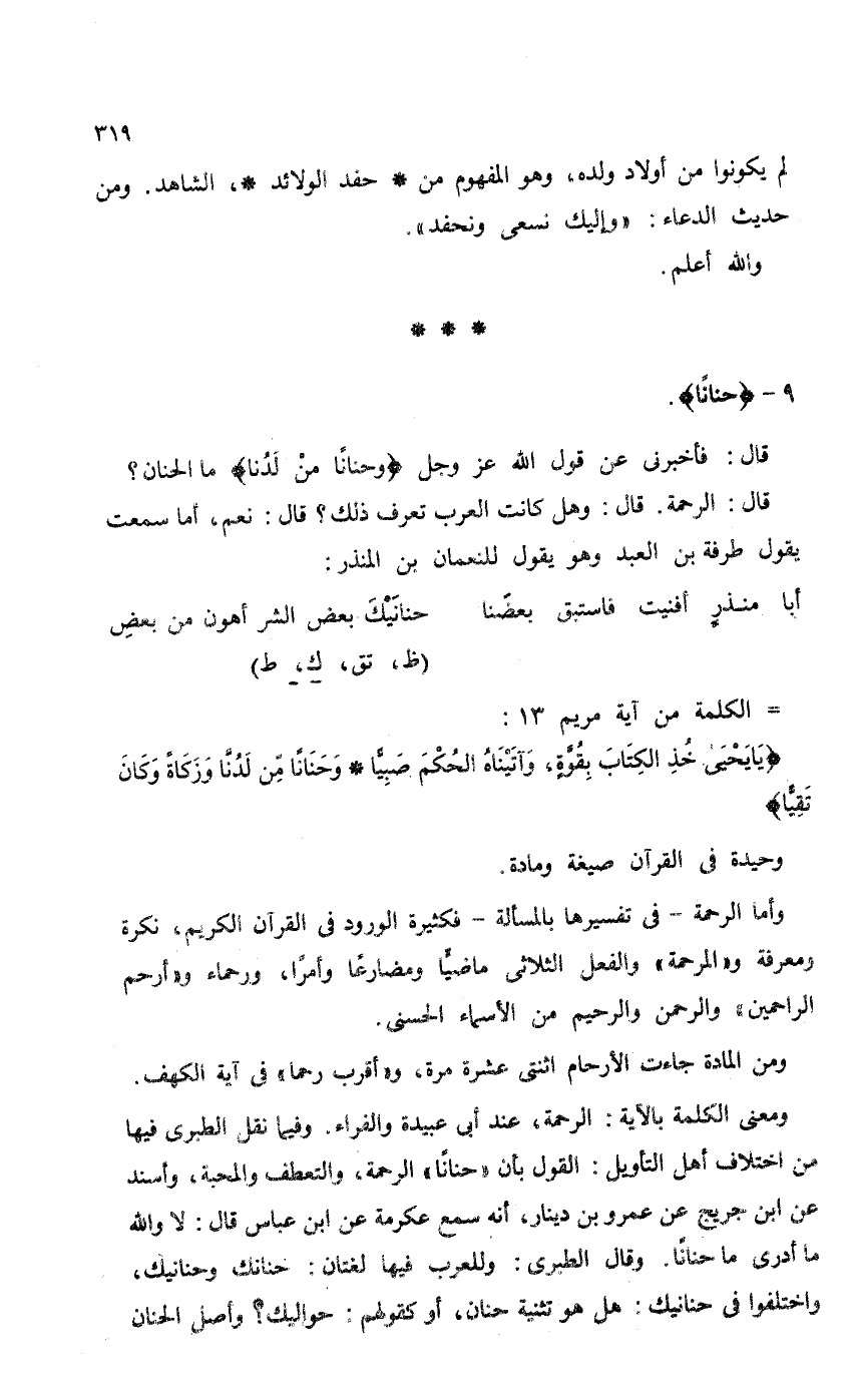 ومعنى الكلمة بالآية: الرحمة، عند أبي عبيدة والفراء. وفيما نقل الطبري فيها من اختلاف أهل التأويل: القول بأن "حناناً" الرحمة، والتعطف والمحبة، وأسند عن ابن جريح عن عمرو بن دينار، أنه سمع عكرمة عن ابن عباس قال: لا والله ما أدري ما حناناً. وقال الطبري: وللعرب فيها لغتان: حنانك وحنانيك، واختلفوا في حنانيك: هل هو تثنية حنان، أو كقولهم: حواليك؟ واصل الحنان