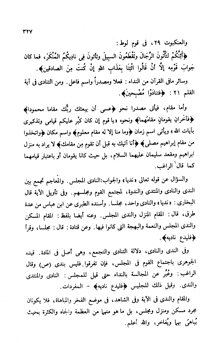والسؤال عن قوله تعالى "نديا" والجواب: النادى المجلس. والمعاجم تجمع بين الندى والنادى والمنتدى والندوة، لمجتمع القوم ومجلسهم. وفي تأويل الآية قال البخاري: "نديا" والنادى واحد، مجلسا. وأسنده الطبري عن ابن عباس من عدة طرق، قال: المقام المنزل والندى المجلس. وعنه أيضاً بلفظ: المقام المسكن والندى المجلس والنعمة والبهجة التي كانوا فيها. وعن قتادة: قال: مجلساً، وقرأ {فَلْيَدْعُ نَادِيَهُ} .