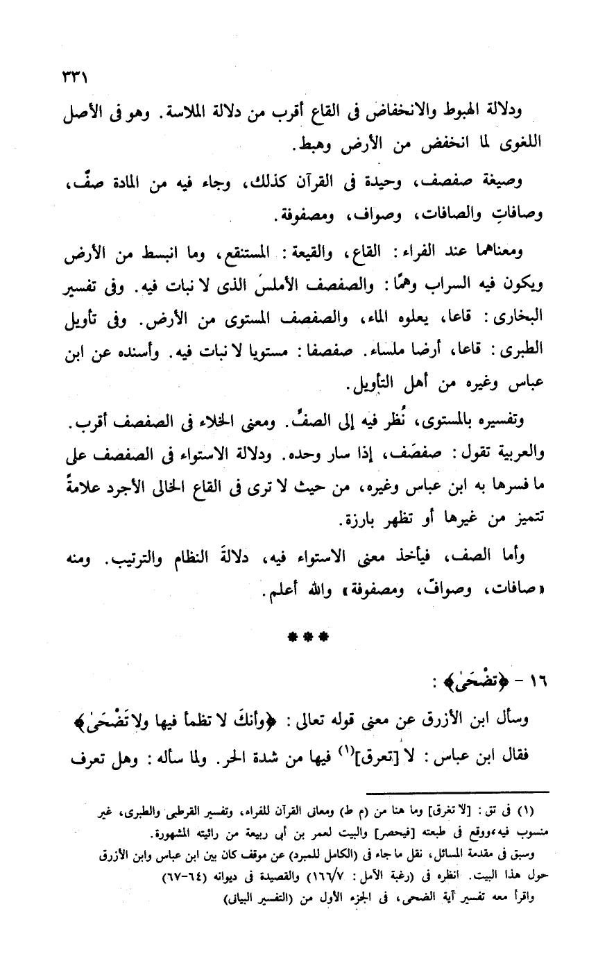 وتفسيره بالمستوى، نُظر فيه إلى الصفَّ. ومعنى الخلاء في الصفصف أقرب. والعربية تقول: صفصَف، إذا سار وحده. ودلالة الاستواء في الصفصف على ما فسرها به ابن عباس وغيره، من حيث لا ترى في القاع الخالي الأجرد علامةً تتميز من غيرها أو تظهر بارزة.