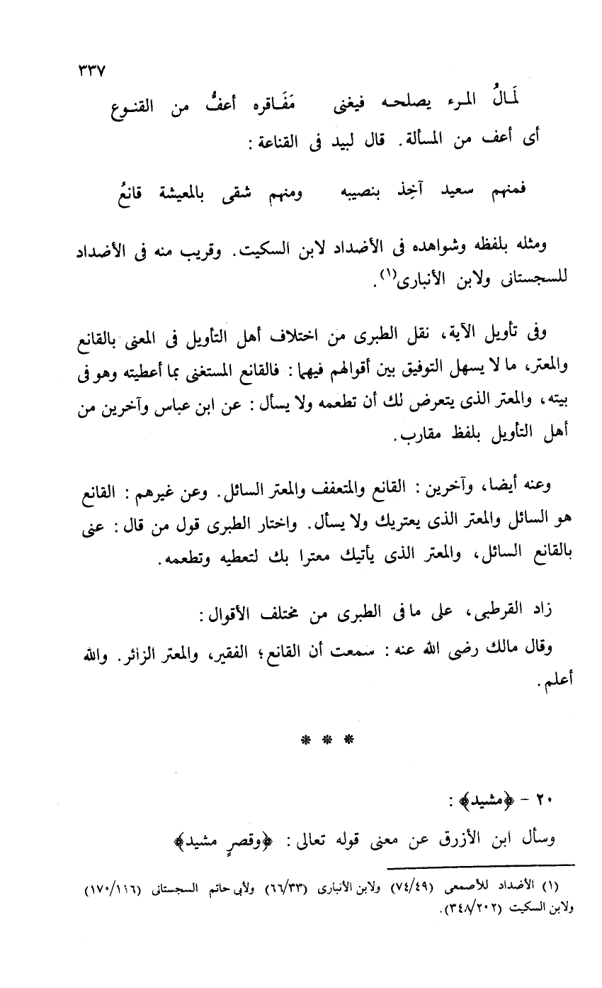 وعنه أيضاً وآخري: القانع والمتعفف والمعتر السائل. وعن غيرهم: القانع هو السائل والمعتر الذي يعتريك ولا يسأل. واختار الطبري قول من قال: عنى بالقانع السائل، والمعتر الذي يأتيك معترا بك لتعطيه وتطعمه.