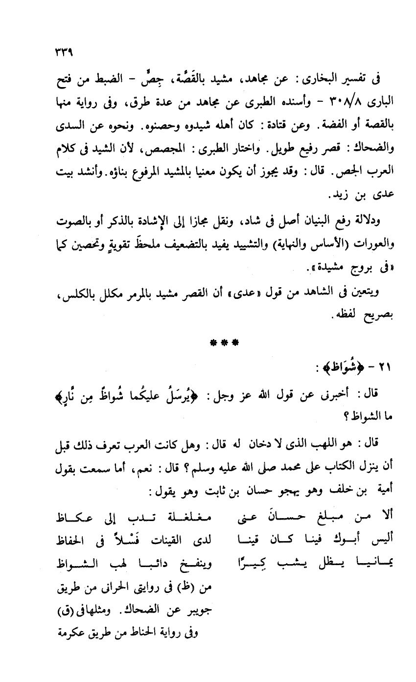قال: هو اللهب الذي لا دخان له قال: وهل كانت العرب تعلاف ذلك قبل أن ينزل الكتاب على محمد - صلى الله عليه وسلم -؟ قال: نعم، أما سمعت بقول أمية بن خلف وهو يهجو حسان بن ثابت وهو يقول: