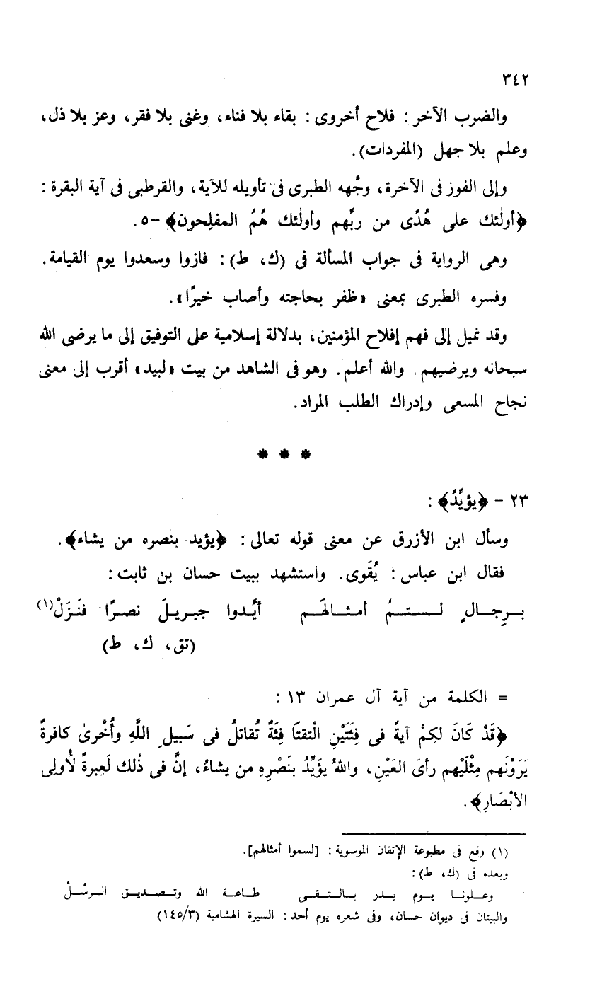 وقج نميل إلى فهم إفلاح المؤمنين، بدلالة إسلامية على التوفيق إلى ما يرضى الله سبحانه ويرضيهم. والله أعلم. وهو في الشاهد من بيت "لبيد" أقرب إلى معنى نجاح المسعى وإدراك الطلب المراد.