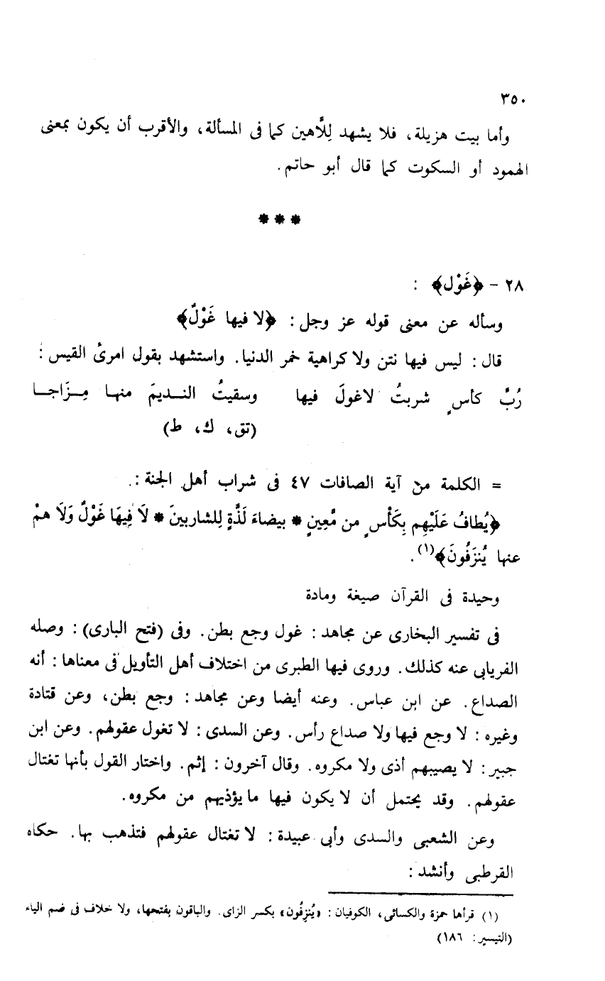 في تفسير البخاري عن مجاهد: غول وجع بطن: وفي (فتح الباري) : وصله الفريابي عنه كذلك. وروى فيها الطبري من اختلاف أهل التأويل في معناها: أنه الصداع. عن ابن عباس. وعنه أيضاً وعن مجاهد: وجع بطن، وعن قتادة وغيره: لا وجع فيها ولا صداع رأس. وعن السدى: لا تغول عقولهم. وعن ابن جبير: لا يصيبهم أذى ولا مكروه. وقال آخرون: إثم. واختار القول بأنها تغتال عقولهم. وقد يحتمل أن لا يكون فيها ما يؤذيهم من مكروه.