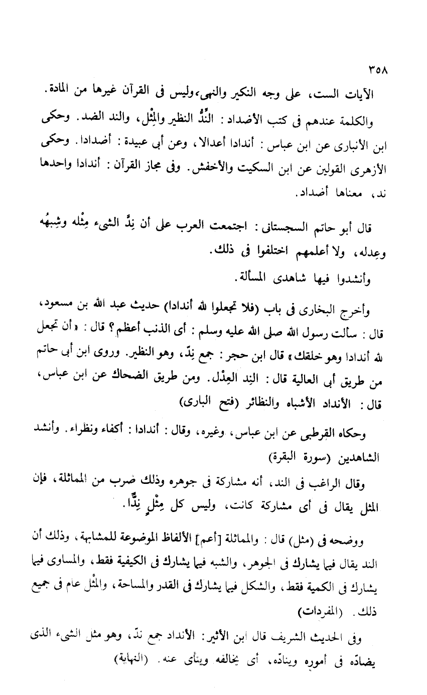 وأخرج البخاري في باب (فلا تجعلوا لله أنداداً) حديث عبد الله بن مسعود، قال: سألت رسول الله - صلى الله عليه وسلم -: أي الذنب أعظم؟ قال: "أن تجعل لله أنداداً وهو خلقك" قال ابن حجر: جمع نِدّ، وهو النظير. وروى ابن أبي حاتم من طريق أبي العالية قال: النِد العِدْل. ومن طريق الضحاك عن ابن عباس، قال: الأنداد الأشباه والنظائر (فتح الباري)