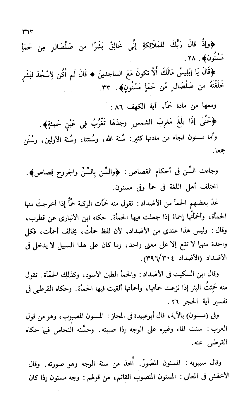 وفي (مسنون) بالآية، قال أبو عبيدة في المجاز: المسنون المصبوب، وهو من قول العرب: سنت الماء وغيره على الوجه إذا صببته. وحسَّنه النحاس فيما حكاه القرطبي عنه.