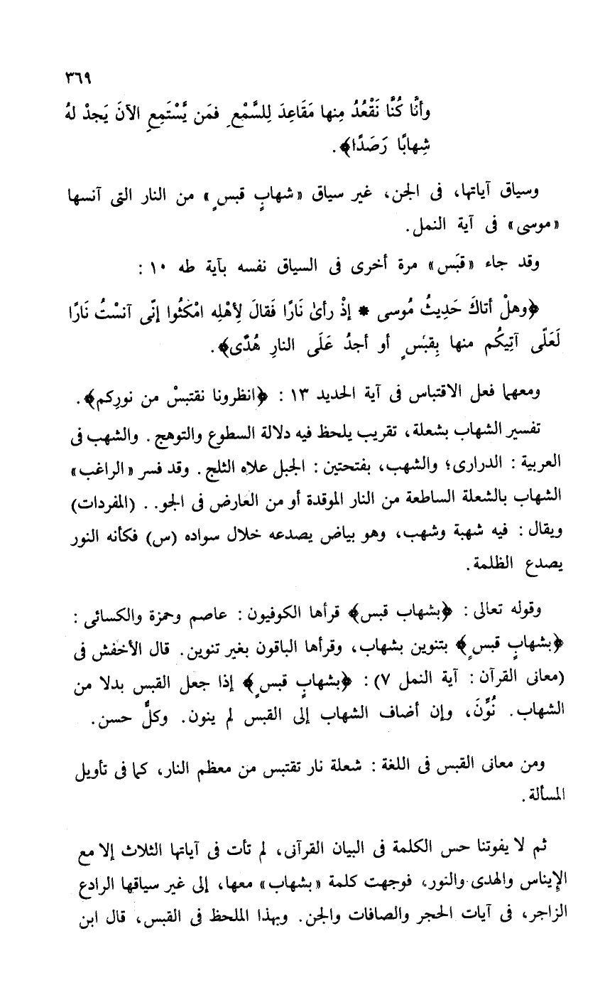 ثم لا يفوتنا حس الكلمة في البيان القرآني، لم تأت في آياتها الثلاث إلا مع الإيناس والهدى والنور، فوجهت كلمة "بشهاب" معها، إلى غير سياقها الرادع الزاجر، في آيات الحجر والصافات والجن. وبهذا الملحظ في القبس، قال ابن