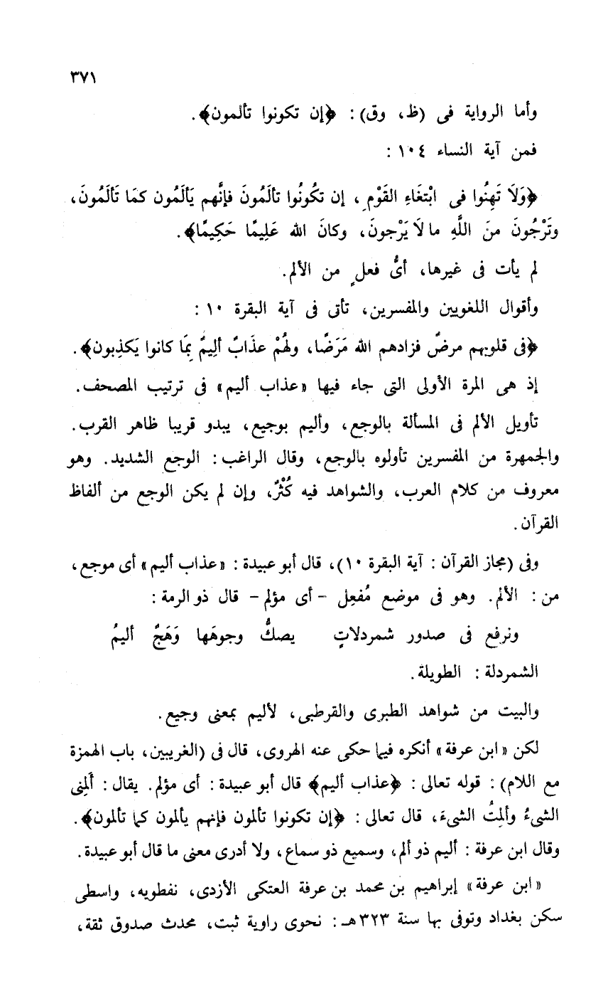 لكن "ابن عرفة" أنكره فيما جكى عنه الهروى، قال في (الغريبين، باب الهمزة مع اللام) : قوله تعالى: {عَذَابٌ أَلِيمٌ} قال أبو عبيدة: أي مؤلم. يقال: أَلمِنى الشيءُ وألمِتُ الشيءَ، قال تعالى: {إِنْ تَكُونُوا تَأْلَمُونَ فَإِنَّهُمْ يَأْلَمُونَ كَمَا تَأْلَمُونَ} . وقال ابن عرفة: أليم ذو ألم، وسميع ذو سماع، ولا أدري معنى ما قال أبو عبيدة. "ابن عرفة" إبراهيم بن محمد بن عرفة العتكي الأزدى، نفطويه، واسطى سكن بغداد وتوفى بها سنة 323 هـ: نحوى راوية ثبت، محدث صدوق ثقة،