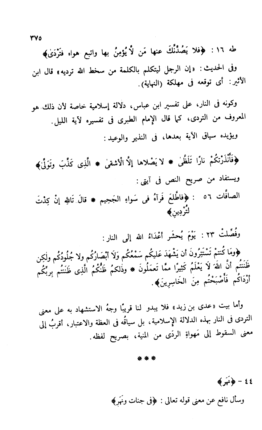 وأما بيت "عدى بن زيد" فلا يبدو لنا قريباً وجهُ الاستشهاد به على معنى التردى في النار بهذه الدلالة الإسلامية، بل سياقه في العظمة والاعتبار، أقربُ إلى معنى السقوط إلى مَهواةِ الردَى من المنية، بصريح لفظه.
