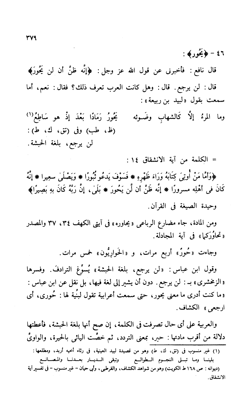 وقول ابن عباس: "لن يرجع، بلغة الحبشة" يُسوَّغ الترادفَ. وفسرها "الزمخشري" بـ: لن يرجع. دون أن يشير إلى لغة فيها، بل نقل عن ابن عباس: "ما كنت أدري ما معنى يحور، حتى سمعت أعرابية تقول لبنُية لها: حُورى، أي ارجعى" الكشاف.