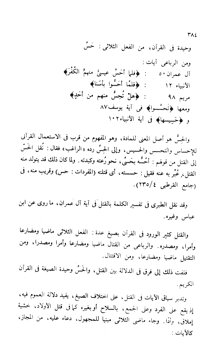 فلفت ذلك إلى فرق في الدلالة بين القتل، والحَسَّ وحيدة الصيغة في القرآن الكريم.