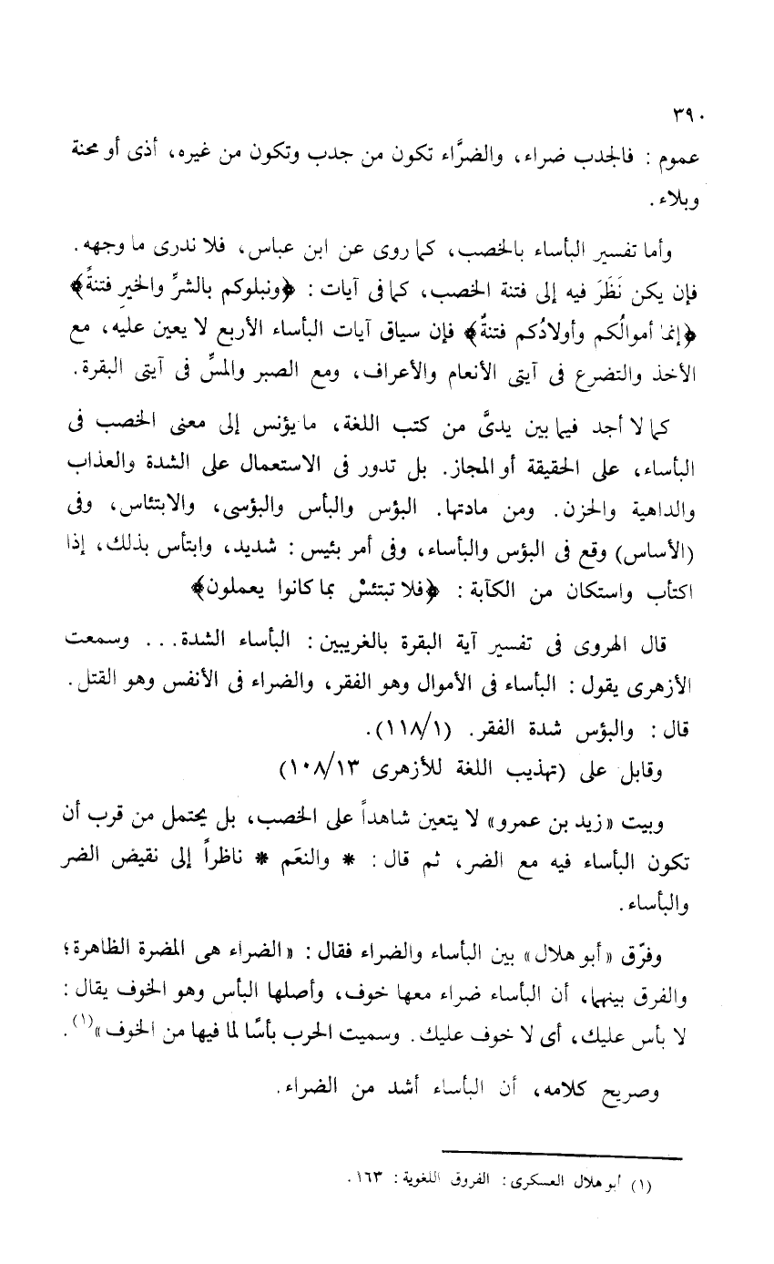 قال الهروى في تفسير آية البقرة بالغريبين: البأساء الشدة. . . وسمعت الأزهري يقول: البأساء في الأموال وهو الفقر، والضراء في الأنفس وهو القتل. قال: والبؤس شدة الفقر. (1 / 118)