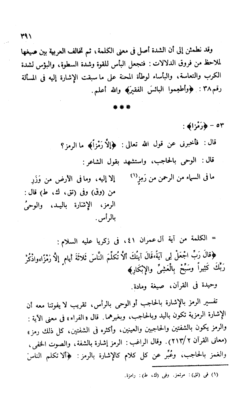 تفسير الرمز بالإشارة بالحاجب أو الوحي بالرأس، تقريب لا يفوتنا معه أن الإشارة الرمزية تكون باليد وبالحاجب، وبغيرهما. قال "الفراء" في معنى الآية: والرمز يكون بالشفتين والحاجبين والعينين، وأكثره في الشفتين، كل ذلك رمز" (معاني القرآن 2 / 213) . وقال الراغب: الرمز إشارة بالشفة، والصوت الخفي، والغمز بالحاجب، وعُبَّر عن كل كلام كالإشارة بالرمز: {أَلَّا تُكَلِّمَ النَّاسَ