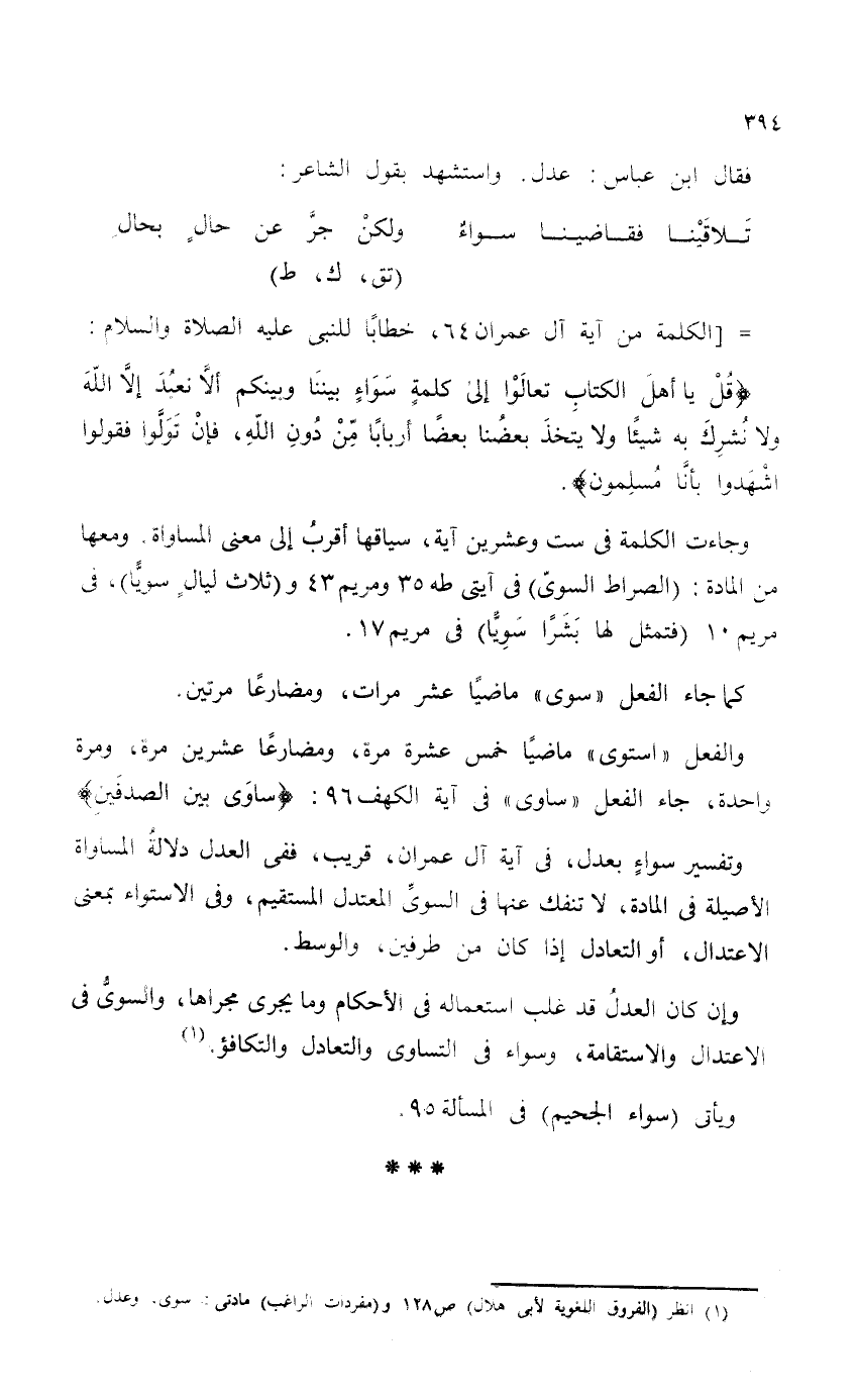 وتفسير سواءٍ بعدل، في آية آل عمران، قريب، ففي العدل دلالةُ المساواة الأصلية في المادة، لا تنفك عنها في السوىَّ المعتدل المشتقيم، وفي الاستواء بمعنى الاعتدال، أو التعادل إذا كان من طرفين، والوسيط.