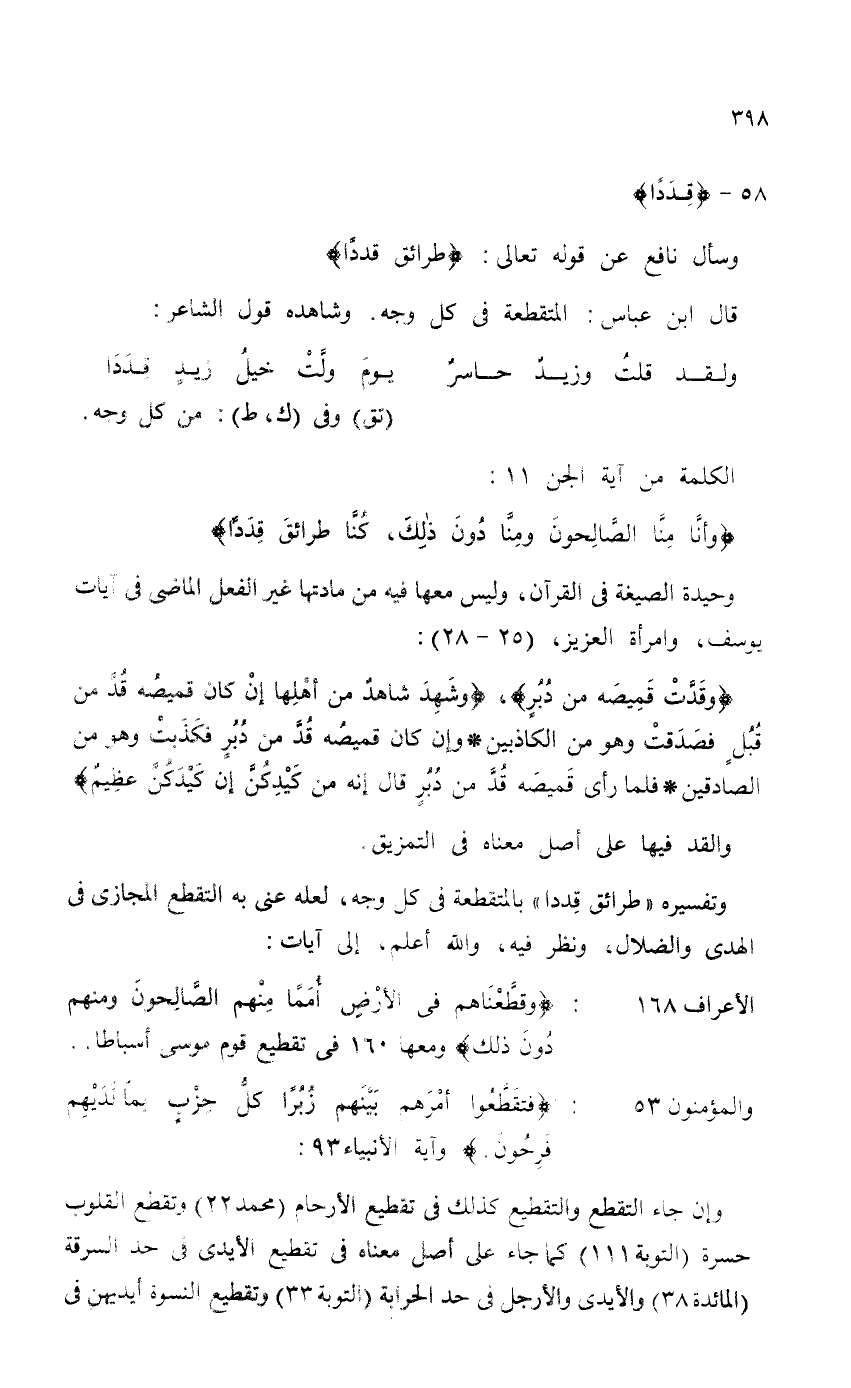 وتفسيره {طَرَائِقَ قِدَدًا} بالمتقطعة في كل وجه، لعله عنى به التقطع المجازي في الهدى والضلال، ونظر فيه، والله أعلم، إلى آيات: